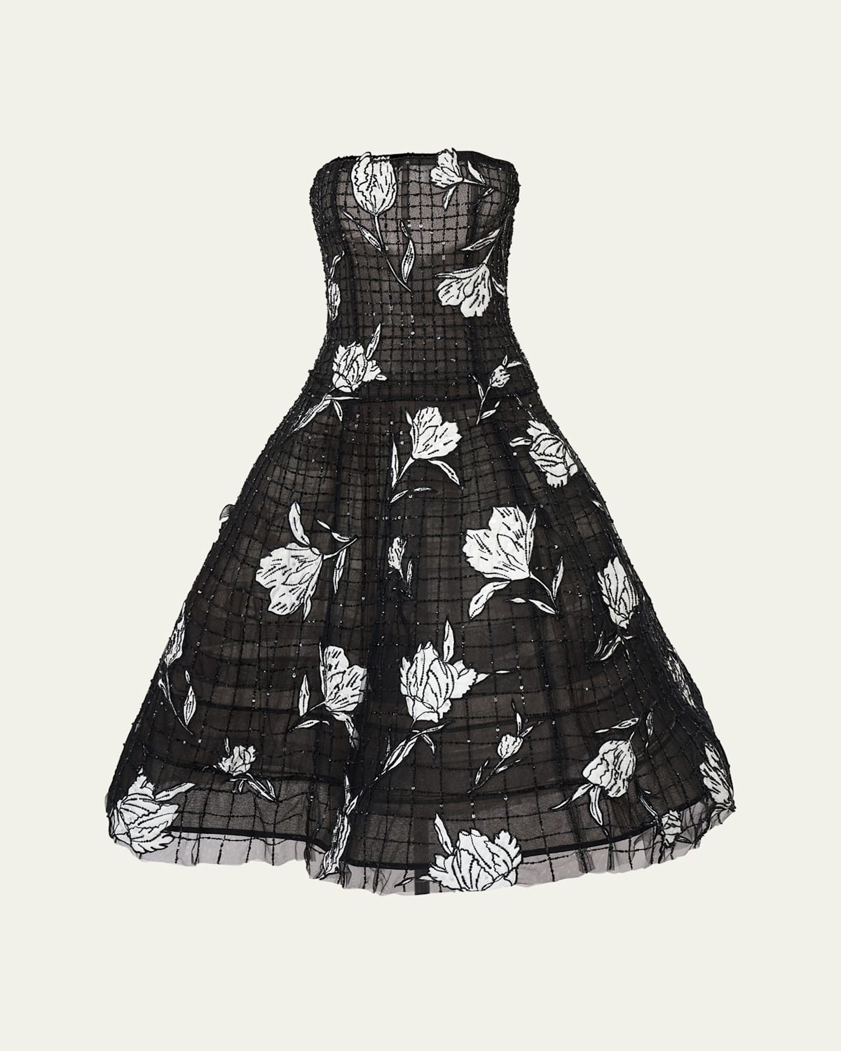 Carolina Herrera dropwaist dress complete with a sequinembellished gridwork design and floral embroideries Strapless neckline Sleeveless Full length Aline silhouette Nylon/polyamide Dry clean Made in USA