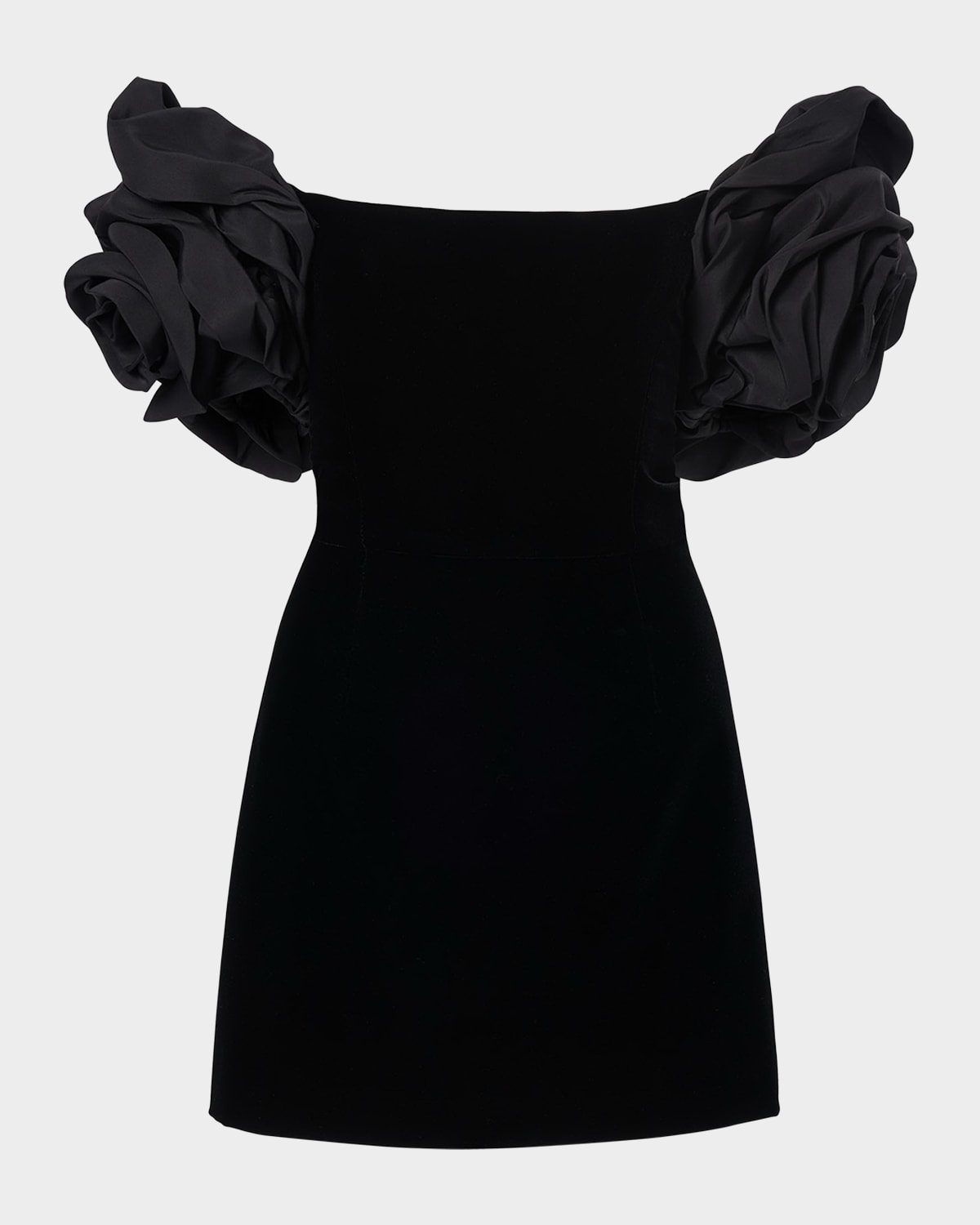 Structured and feminine, this Carolina Herrera velvet mini dress is designed with exaggerated rosette sleeves and a figureflattering Aline silhouette Offtheshoulder neckline Short sleeves Hem falls above the knee Aline silhouette Invisible back zipper Rayon/cellulose acetate/polyurethane Dry clean Made in the USA