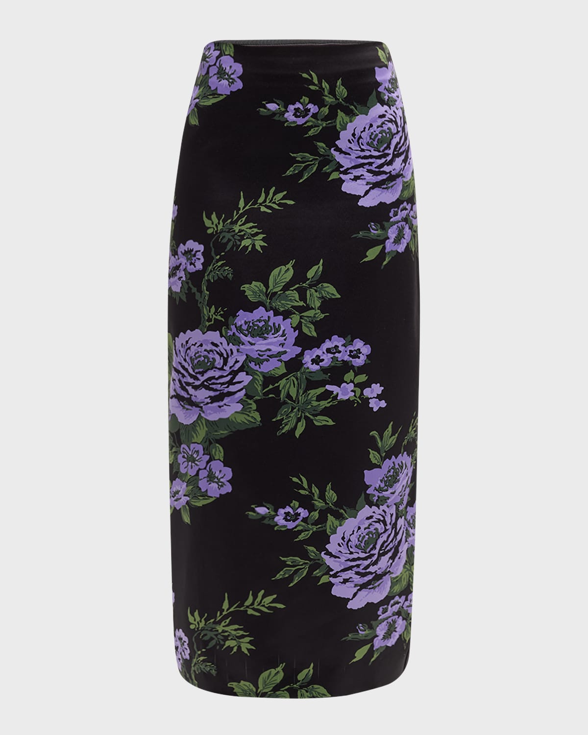 Carolina Herrera satin skirt featuring a floral print High waist Hem falls below the knee Pencil style Centerback vented hem Invisible back zip Acetate/nylon/polyamide/elastane Dry clean Made in USA