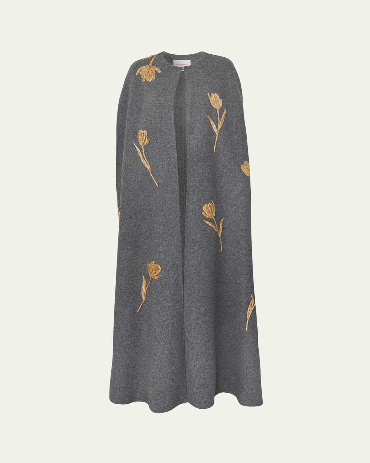 Long cape by Carolina Herrera, crafted from virgin wool and elevated with golden tulip embroidery. Roud neckline Sleeveless Full length Front hook closure Virgin wool Dry clean Made in Italy
