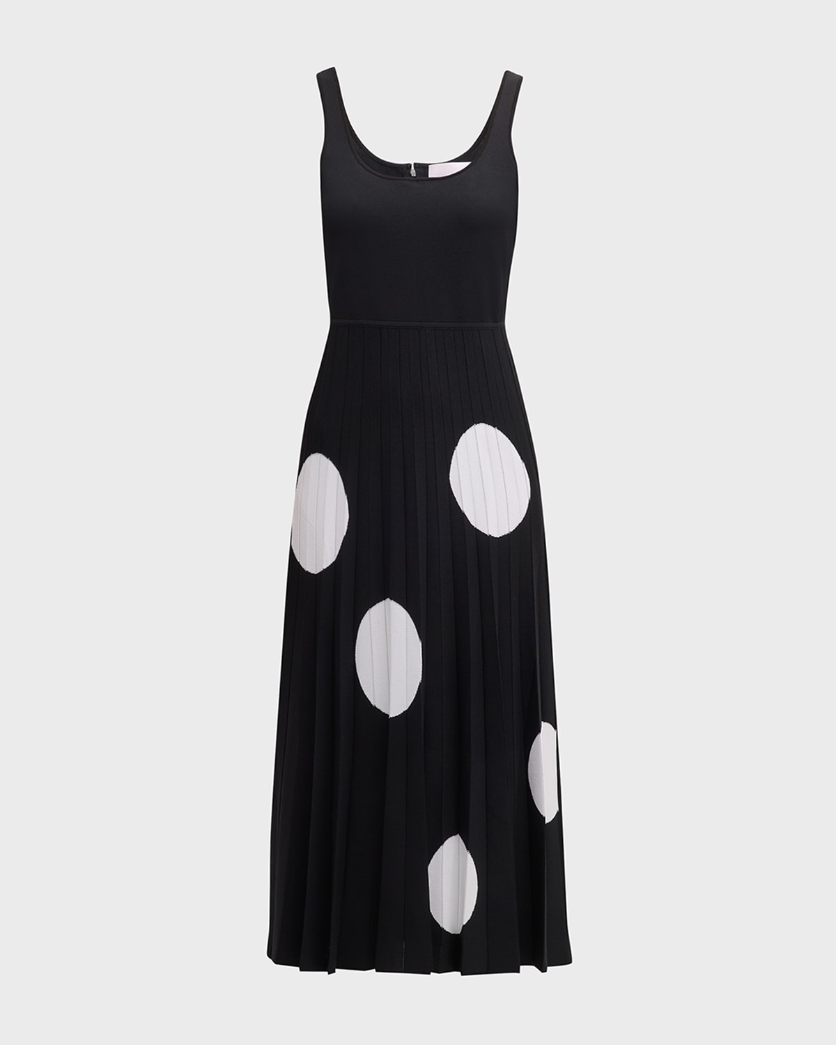 Carolina Herrera knit dress with pleated polka dot skirt Scoop neckline Sleeveless Aline silhouette Midi length Back zip Viscose/polyester/nylon/polyamide Dry clean Made in Italy
