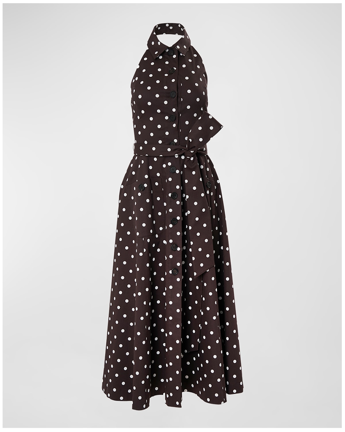 Carolina Herrera halter shirtdress in allover polkadots featuring a selftie belted waist Halter neckline; spread collar Button front closure Sleeveless Open back Selftie adjustable belt Side slip pockets; button closure Hem falls below the knee Aline silhouette Cotton/elastane Dry clean Made in Italy