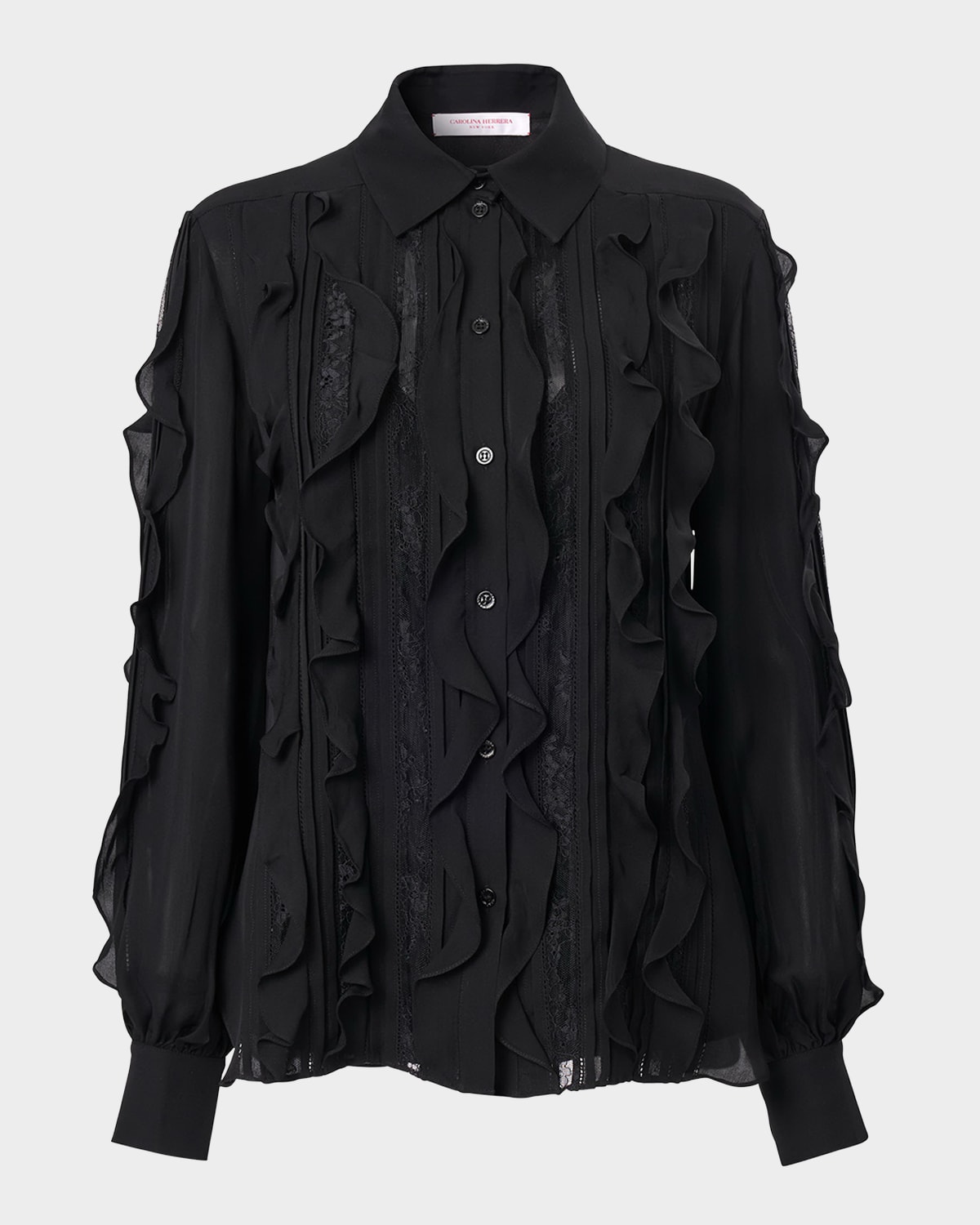 Carolina Herrera blouse exudes Victorian sensibility with cascading ruffles and intricate sheer lace panels Point collar; button placket Long bishop sleeves Twobutton barrel cuffs Hip length Relaxed fit Silk Dry clean Imported