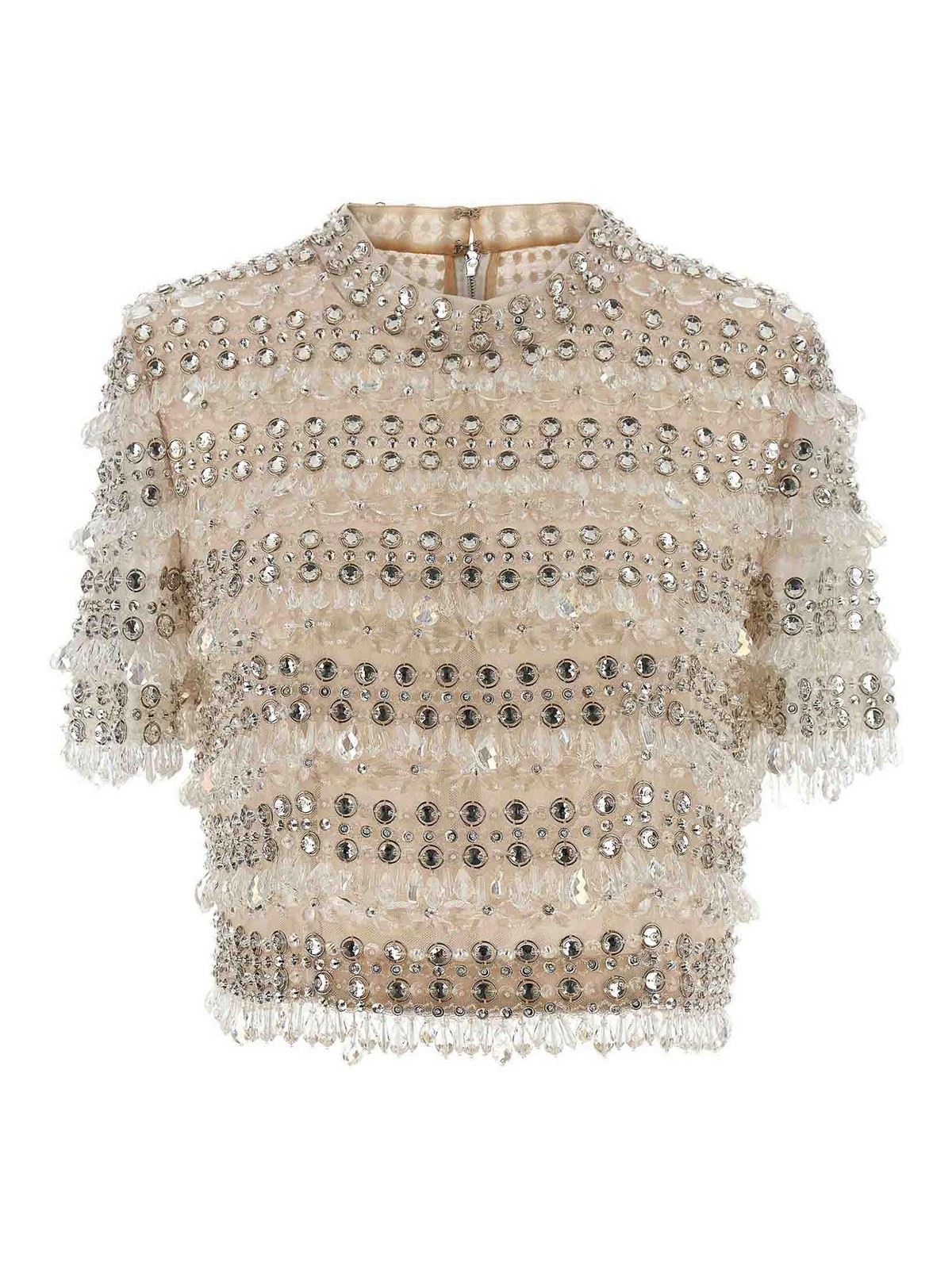 haut court en cristal brodé orné de strass et orné de strass, col montant, col montant, fermeture éclair au dos, manches courtes