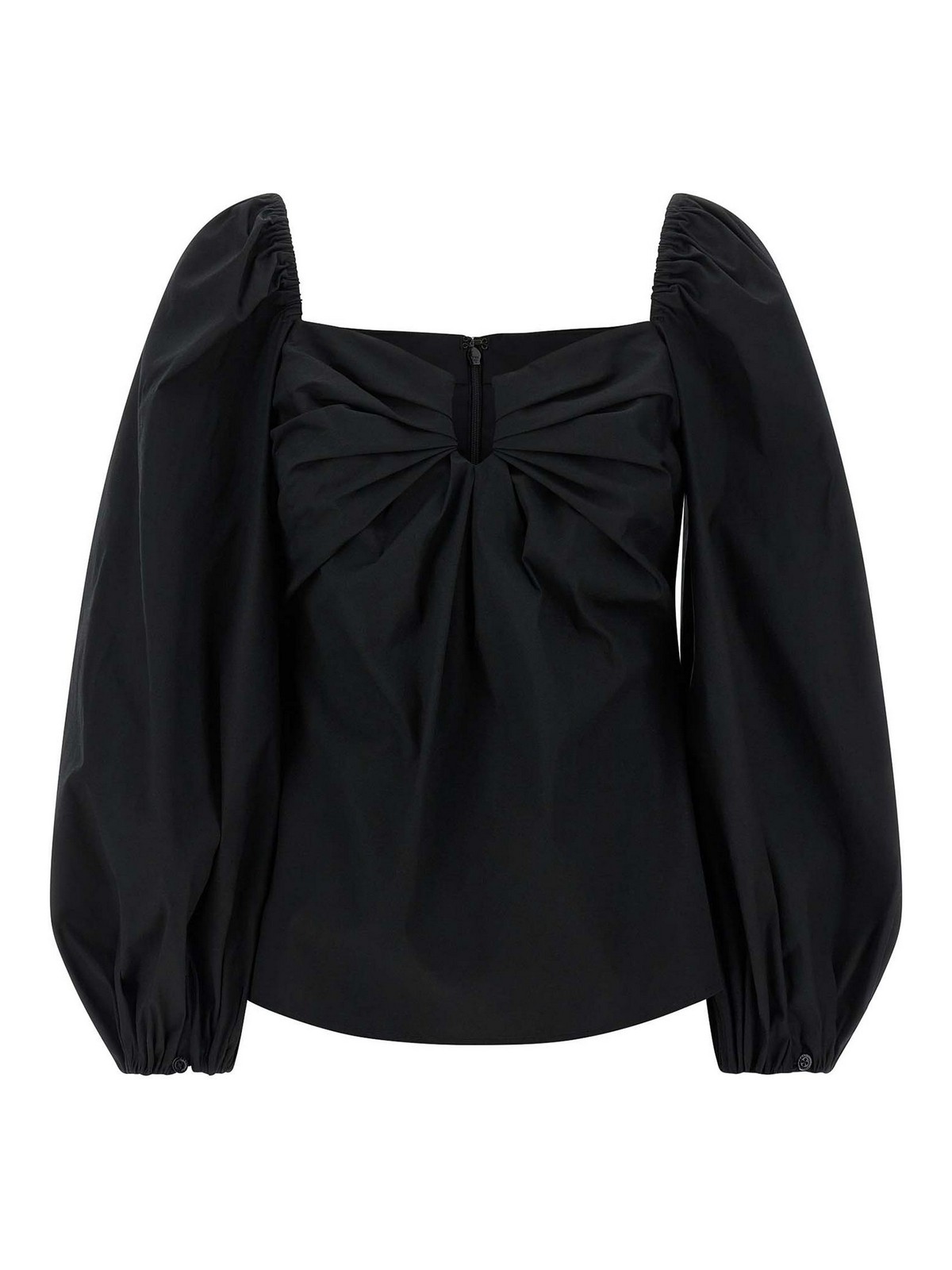 Top en popeline de coton à manches bouffantes, encolure ronde à armatures et ondulation au centre du dos, fermeture éclair et crochet