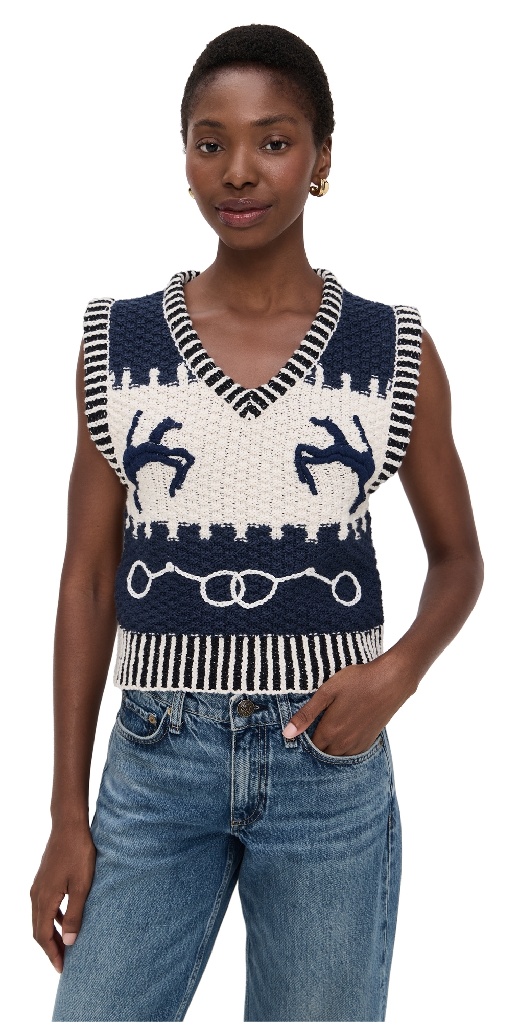 Fabric: Mid-weight chunky knit with stretch. Stripe contrast trim. Embroidered details. Dog graphic at front. V neck. Sleeveless. Shell: 100% cotton. Dry clean. Imported, Peru. Measurements: Measurements from size S Length: 19.75in / 50.0cm, from shoulder