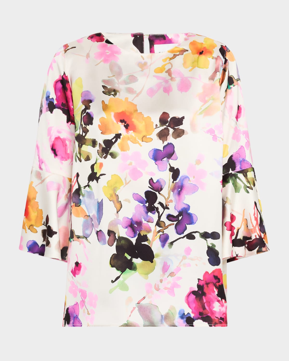 Caroline Rose "Bella" satin tunic in Brilliant Bouquet floral print Scoop neckline 3/4 bell sleeves; approx. 19"L Hem side slits Relaxed fit Keyhole button back Slipover style Polyester Unlined Dry clean Made in the USA from imported materials