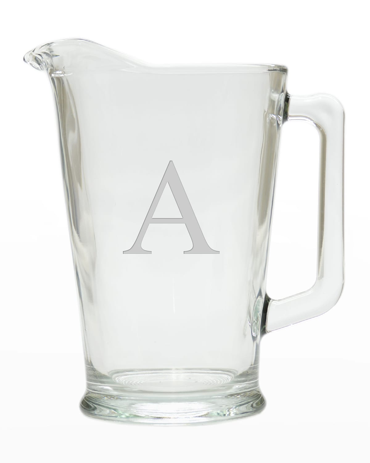 Pitcher made of leadfree glass. Beautiful custom carved personalization! Each holds 60 ounces. 5.5"Dia. x 8.5"T each. Dishwasher safe. Made in the USA.