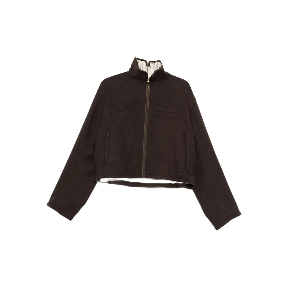 dark brown high neck front zip fastening striped inner collar long sleeves