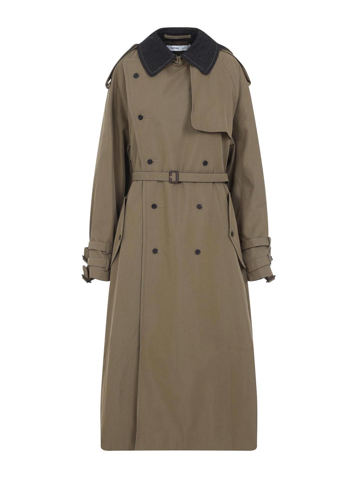 Trench-coat Carven, marron, ocre et ocre, col contrastant, manches longues, style à double boutonnage, poignets ceinturés, construction en tranchée, poches latérales entièrement doublées, coupe fidèle à la taille