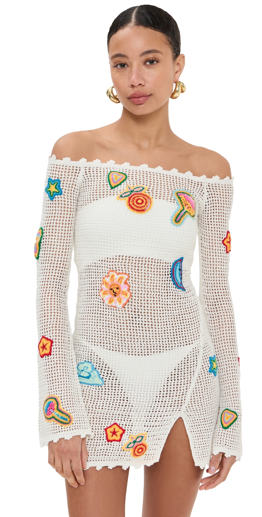 Fabric: Lightweight stretch crochet. Optional, adjustable shoulder straps. Embroidered patches throughout. Mini length. Boat. Long sleeves. Pullover design, no closure. Shell: 35% cotton/30% polyester/18% silk/17% linen. Unlined. Hand wash. Imported, China. Measurements: Measurements from size XS Length: 29.25in / 74.0cm, from shoulder