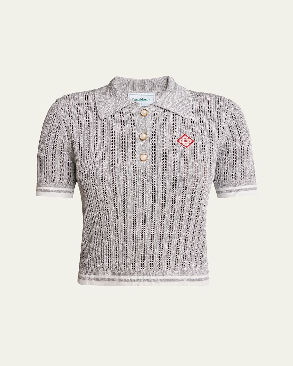 CASABLANCA silver knit polo top features a logo patch detailing at the front Spread collar; button closure Short sleeves Ribbed trim Hip length FItted Viscose/polyester Dry clean Imported
