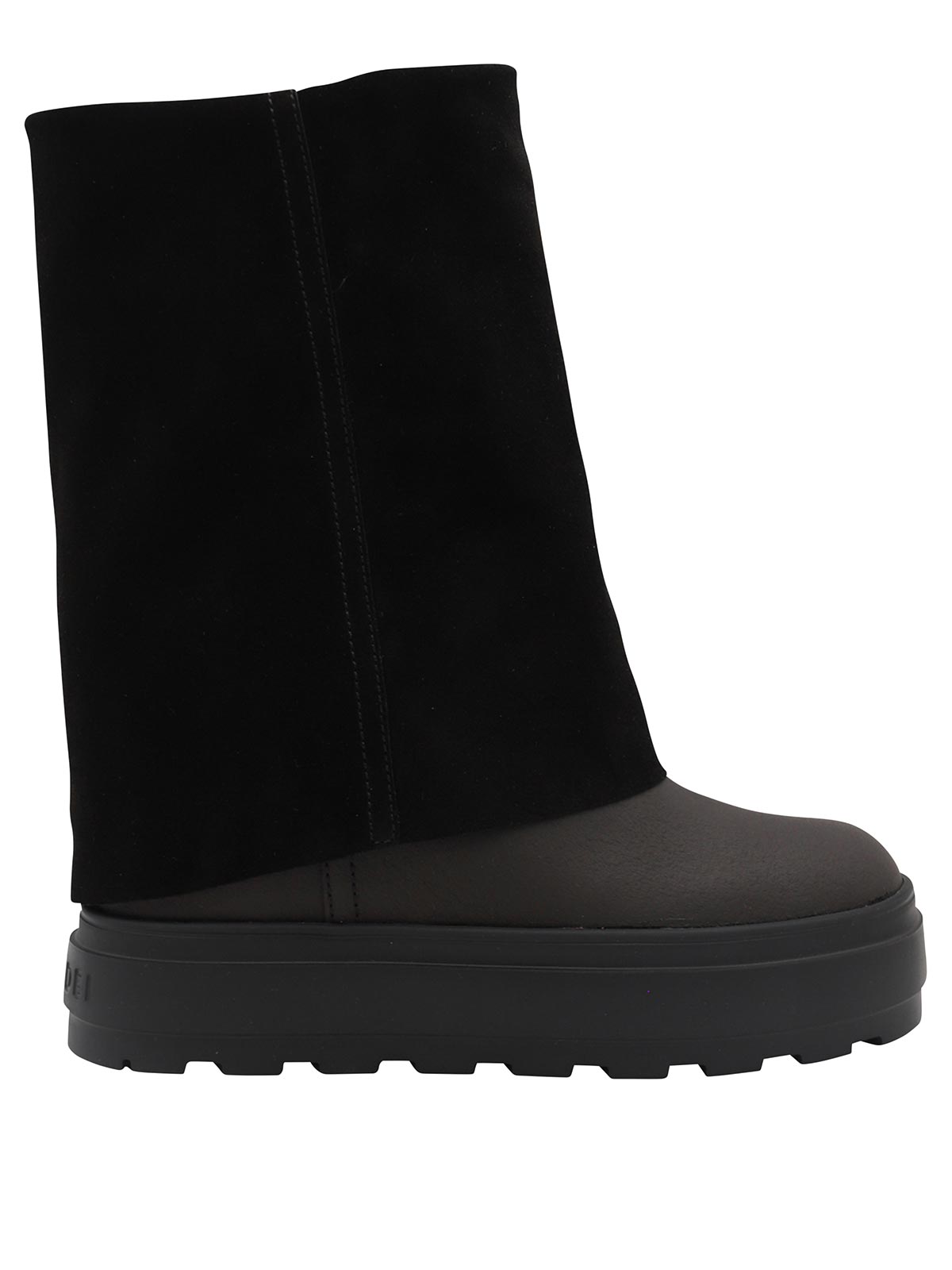 Bottes noires de la marque Casadei à bout rond surdimensionnées sous la longueur du genou et