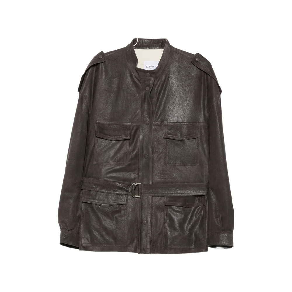 dark brown textured finish band collar epaulettes front press-stud fastening front flap pockets belted waist long sleeves press-stud cuffs