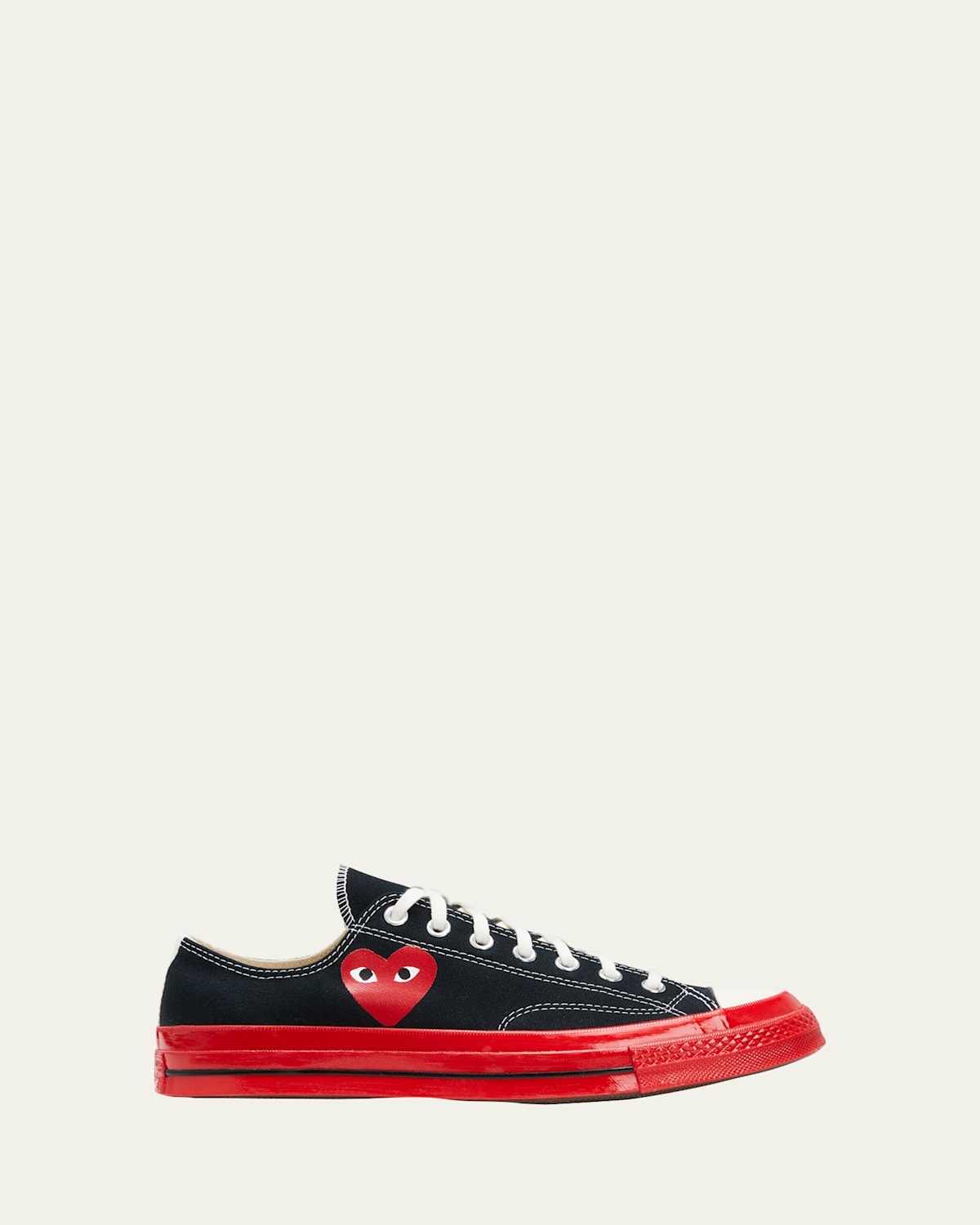 Comme des Garcons PLAY x Converse collaboration lowtop sneakers with canvas upper Flat heel Round cap toe Laceup vamp Embossed logo heel Heartandeyes logo at the side Red sole Rubber outsole Imported