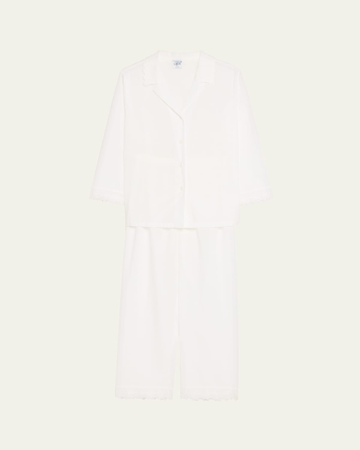 Celestine "Conny" Swiss cotton pajama set detailed with floral cotton guipure lace trim Notched lapels; button front Bracelet sleeves Relaxed fit Includes matching pants Cropped at the ankle Straight legs Pullon style Cotton Trim: Lace Made in Germany