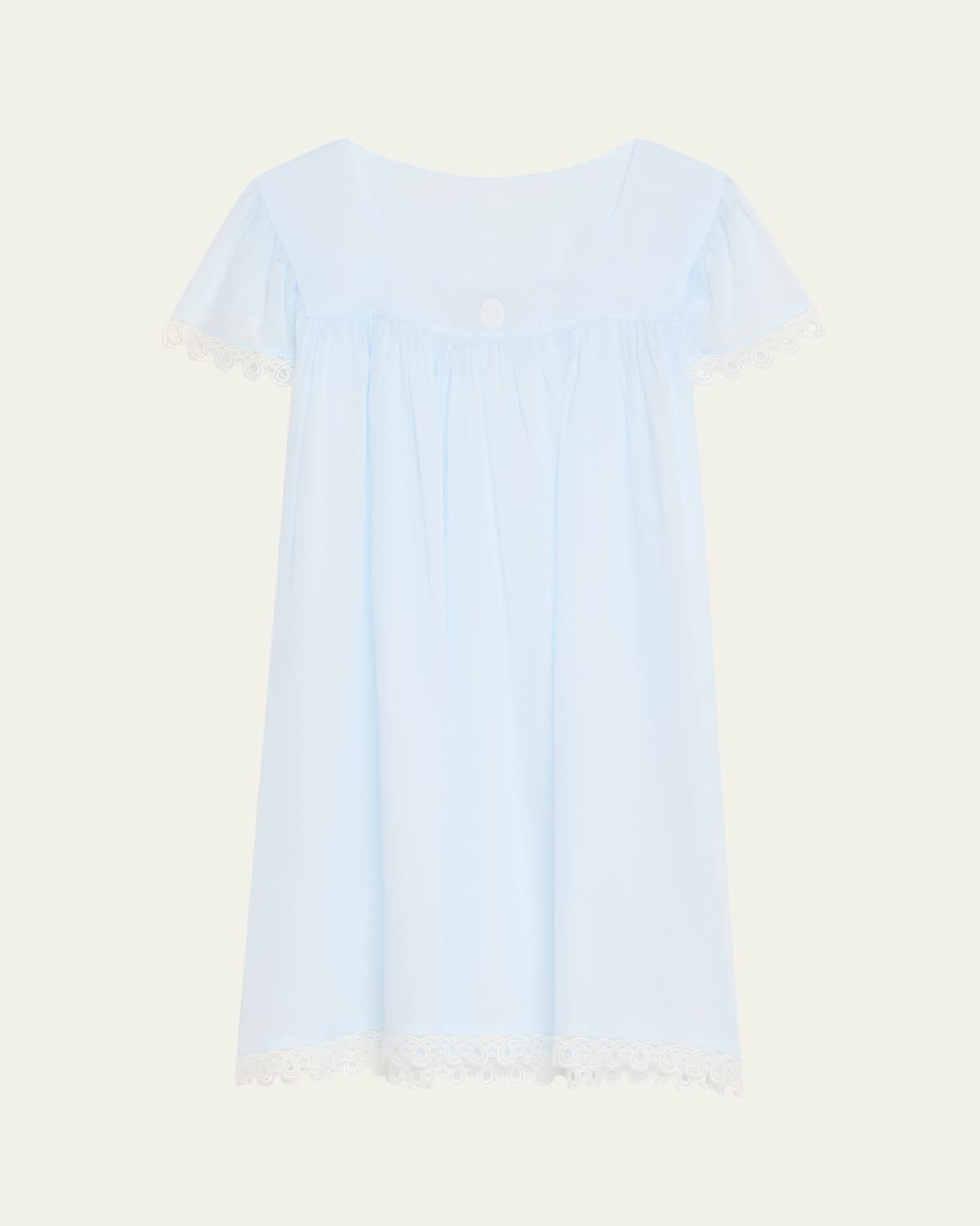 Made of Swiss cotton, the "Harriette 2" ruched babydoll from Celestine is detailed with scalloped viscose guipure lace trim Scoop neckline Short sleeves Ruched back yoke Hem falls above the knee Shift silhouette Slipover style Cotton/viscose Trim: Lace Made in Germany