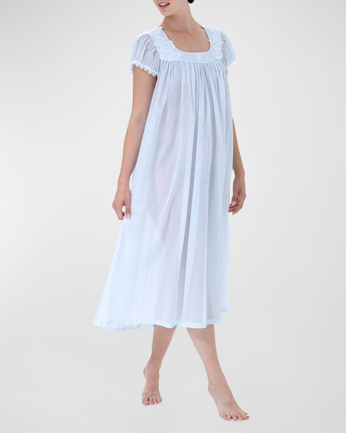 Celestine "Ronya2" ruched nightgown with floral lace trim Approx. 49"L from shoulders to hem Scoop neckline Short sleeves; approx. 6"L Hem falls below the knee Shift silhouette Slipover style Cotton/cotton Machine wash warm Trim: Lace Made in Germany