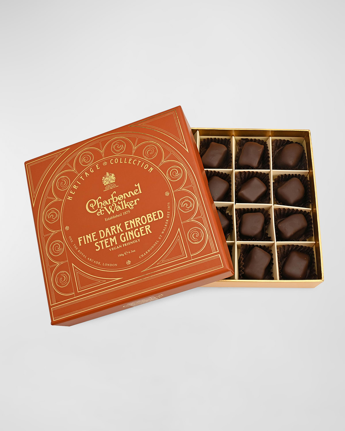 Chocolates in a decorative box Vegan Box, approx. 6.14"L x 1.3"H Net weight: 6.17 Shelf life: N/A Made in United Kingdom Ingredients: Ginger, cocoa mass, sugar, cocoa butter, emulsifier (soya lecithin). Allergens: Soybeans