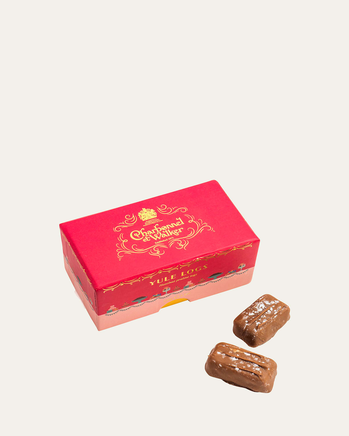 A Madame Charbonnel delight, these festive treats are Praline filled Yule shaped Chocolate Logs, enrobed in Milk Chocolate and lightly dusted with a sprinkling of icing sugar. Net. wt. 35 ounces. Shelf life: 6 months. Made in the United Kingdom.