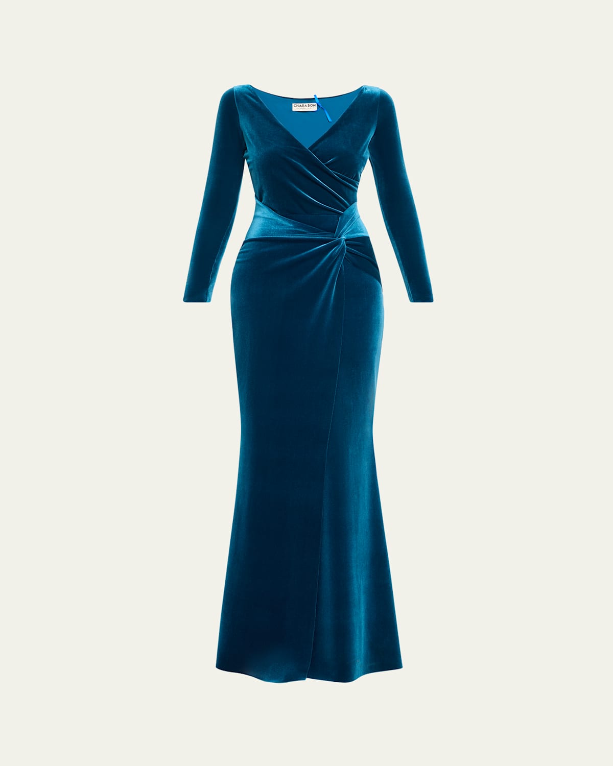 Chiara Boni La Petite Robe "Axas" velvet gown features a side twist Rawedged hem for ease of tailoring, will not fray if cut Approx. 64.5"L from shoulders to hem Surplice neckline Bracelet sleeves Full length Trumpet silhouette Polyester/nylon/polyamide/elastane Machine wash cold Made in Italy