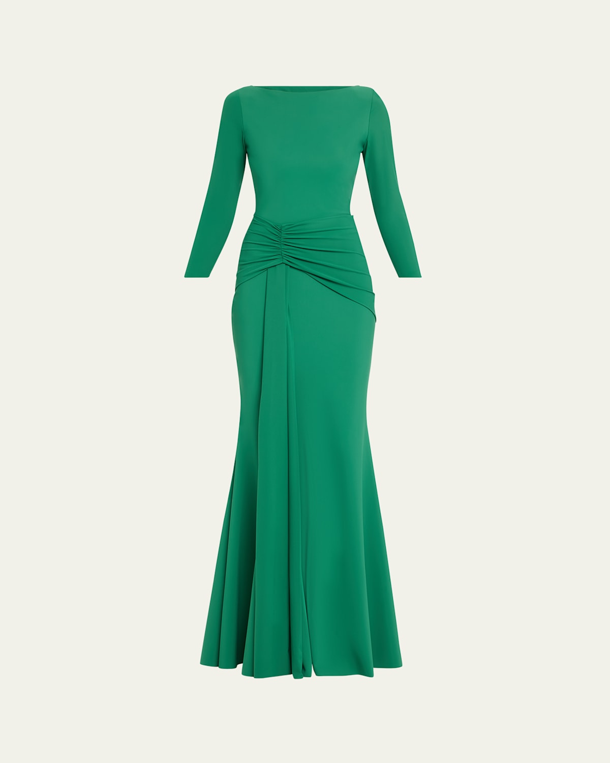 Made of fluid jersey, the Chiara Boni La Petite Robe "Shir" gown is detailed with a ruched gathering and front drape Rawedged hem for ease of tailoring, will not fray if cut Approx. 63.5"L from shoulders to hem High neckline 3/4 sleeves Full length Trumpet silhouette Stepin style Nylon/polyamide/elastane Machine wash cold Made in Italy