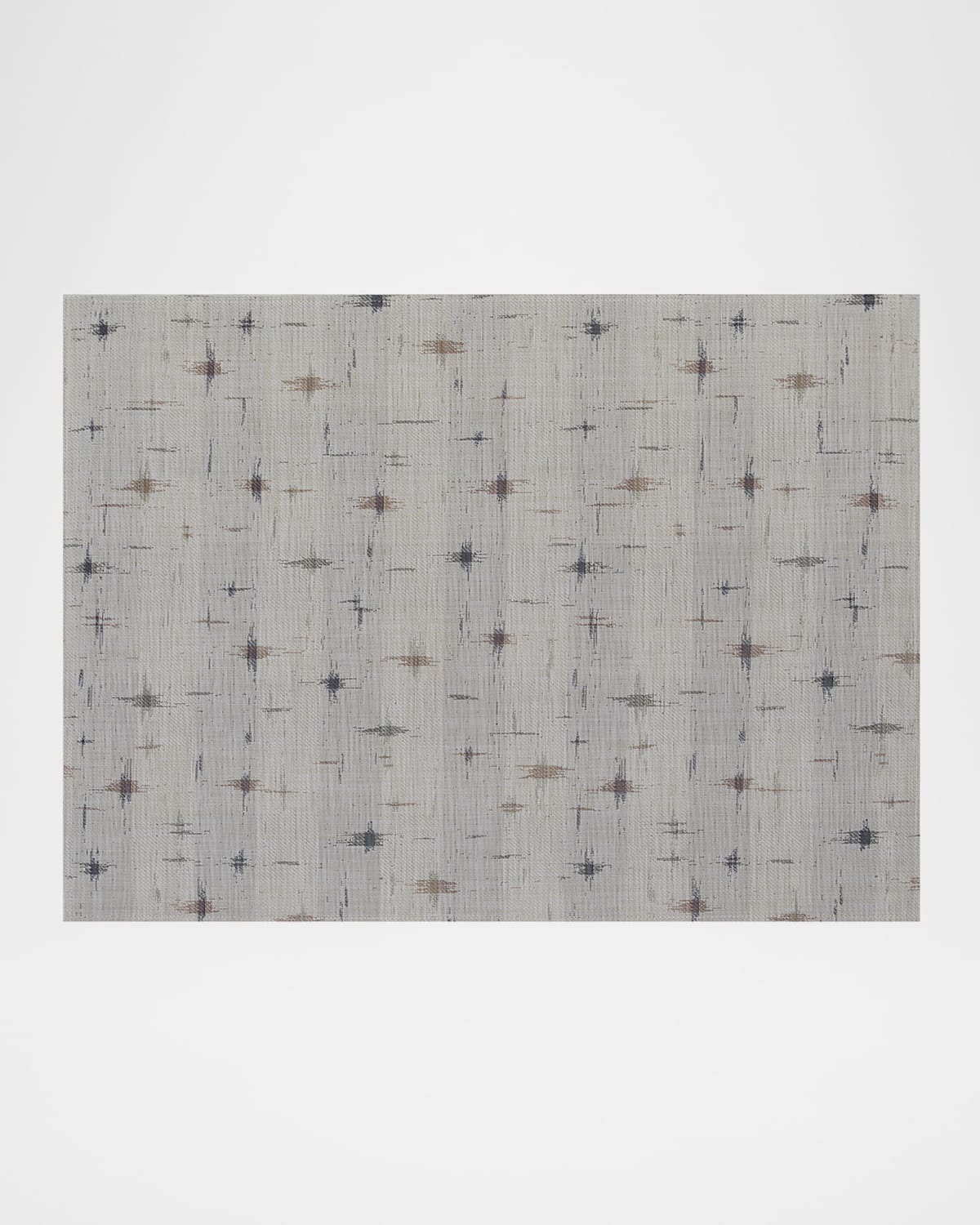 Spark is based on traditional ikats, fabrics created by resistdyeing yarns before they are woven. The Chilewich design team looked to this multifaceted process-in which bundles of yarn are wrapped together, dyed in sequence, and then aligned on the loom to create a desired pattern-to inspire the development of a double weave flecked with blurrededge bursts of color that extend vertically or horizontally, intersecting in dynamic crosshatchings. The large scale of Spark's repeat makes each placemat unique. Handcrafted of vinyl and polyester with slipresistant latex backing For indoor/outdoor use Item Weight (Lbs.): 9.6 Spot clean, vacuum periodically, wipe clean Size is approximate Made in USA