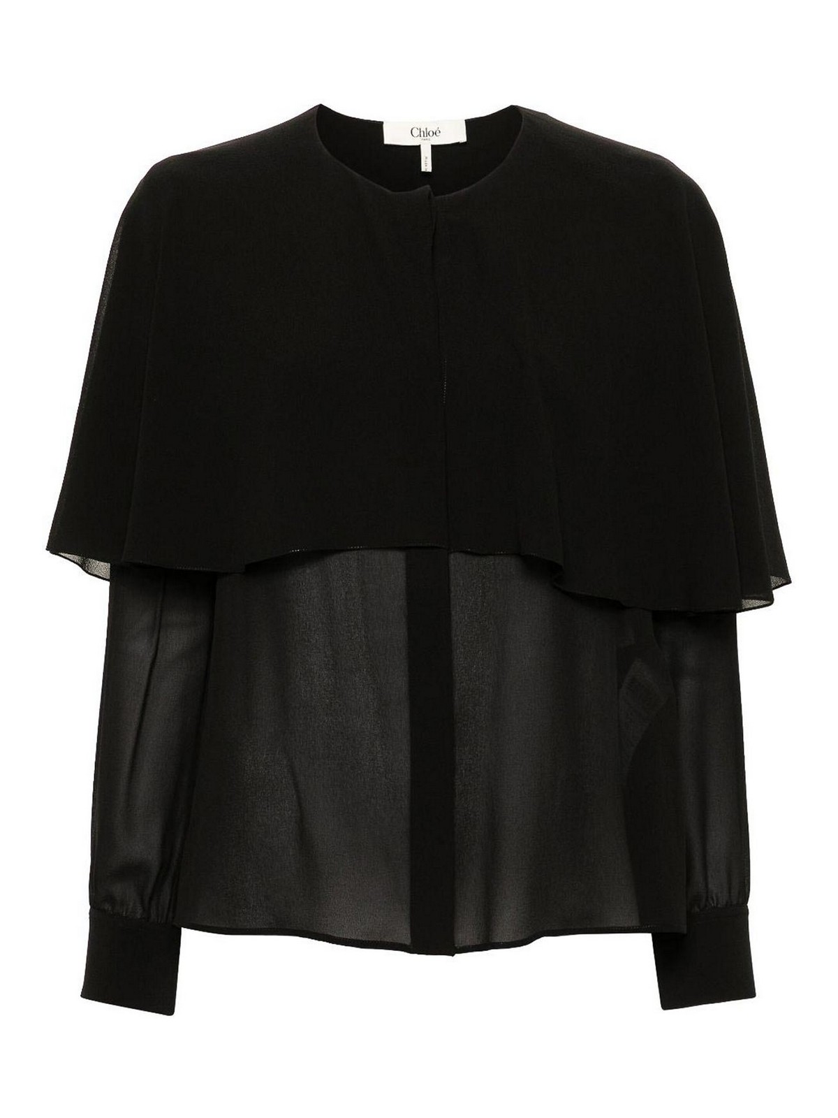 Crêpe georgette noire semi-transparente, col rond, fermeture cape, manches longues avec poignets boutonnés, ourlet droit, bouton dissimulé