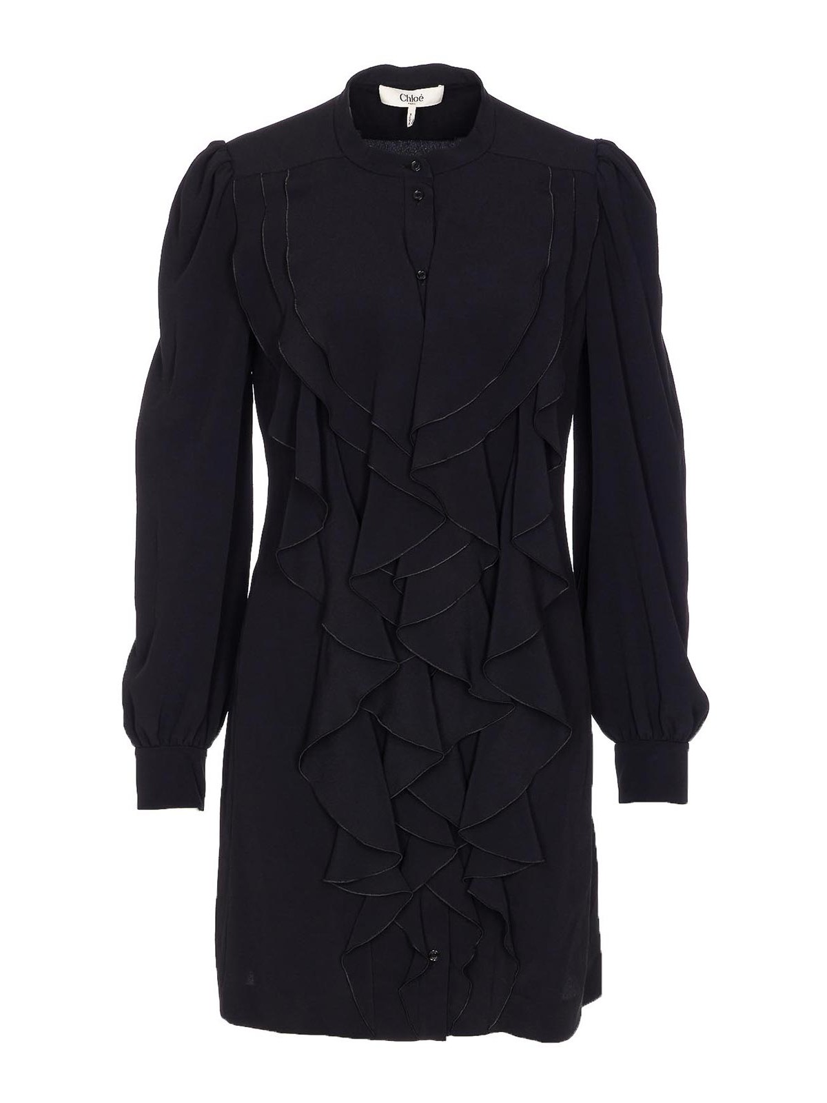 Chemise longue noire Chlo, fermeture boutonnée, ruches sur l'ensemble, manches longues