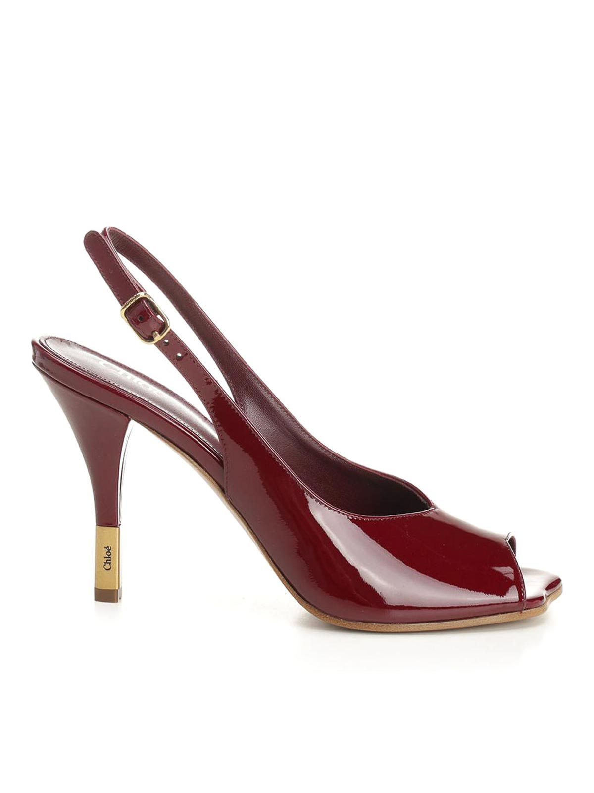 Sandales à bride arrière en cuir verni Chlo avec talon fleuri et bout ouvert sur le devant