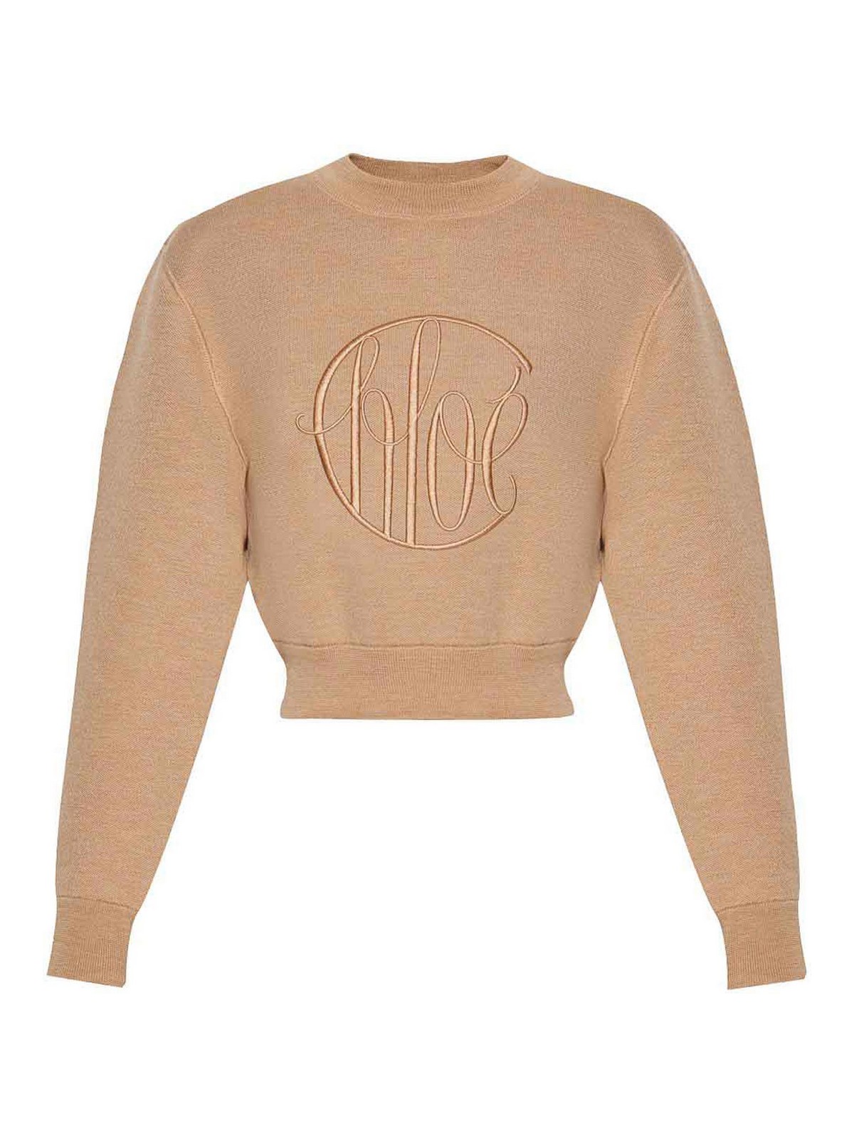 Laine, construction tricotée, logo brodé, coupe courte, col rond, manches longues