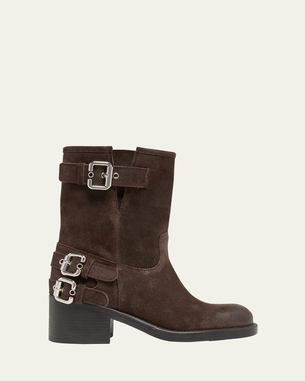 Inspired by the classic biker silhouette, the "Dakota" ankle boots by Chloe are crafted from calf suede with silvertone Paddington buckles 2.36 in / 60 mm block heel Round toe Adjustable side buckle straps Pullon style Leather lining Rubber outsole Made in Italy