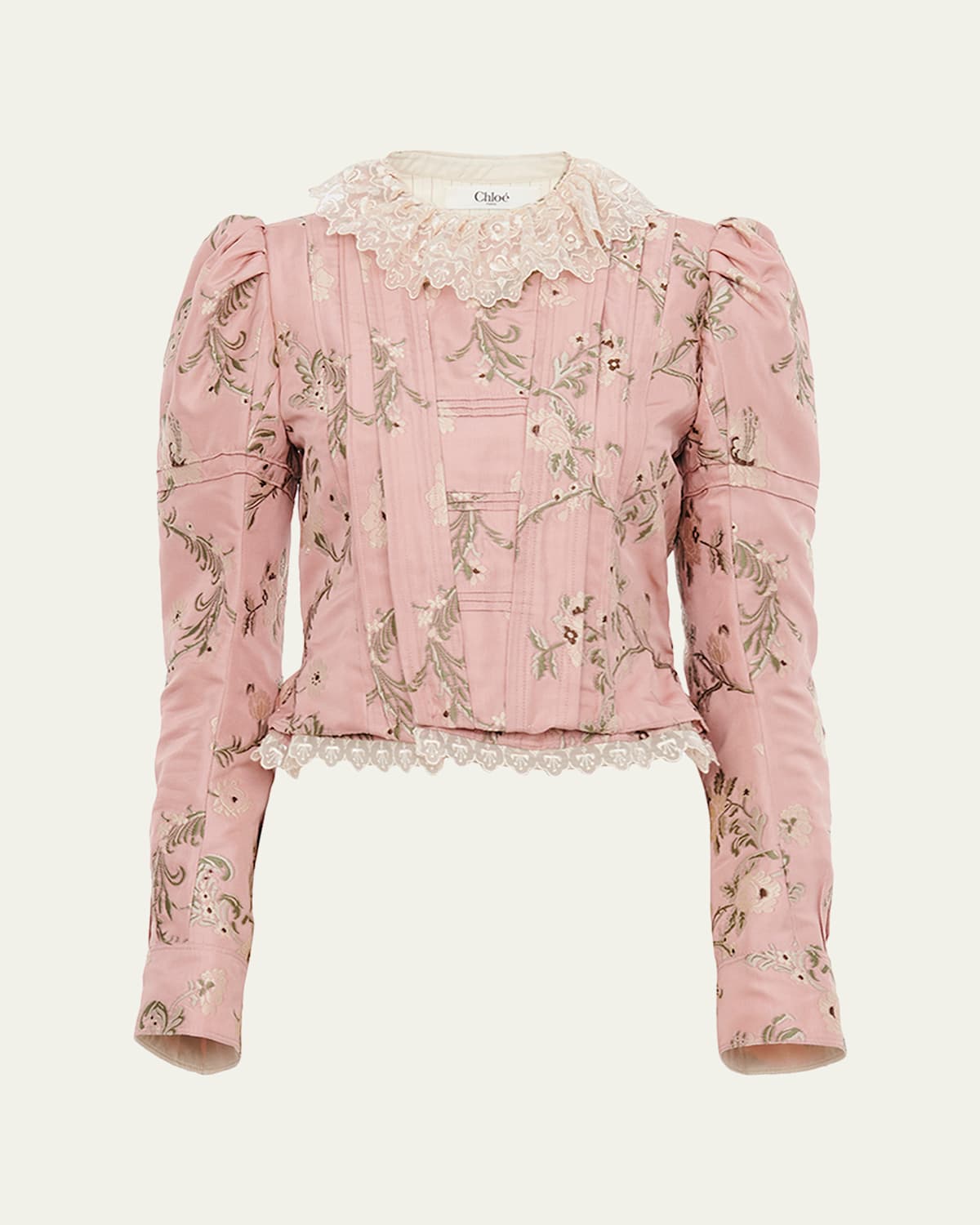 Romantic yet structured for a dramatic edge, this Chloe jacket is woven in a floral jacquard taffeta and detailed with lace trim, puff shoulders, and pleated details Ruffle collar with throat latch; singlebreasted front Long puff sleeves Unfinished cuffs Slim fit Hip length Silk/polyester Lining: Viscose/cotton Dry clean, professional cleaning recommended Trim: Lace Imported