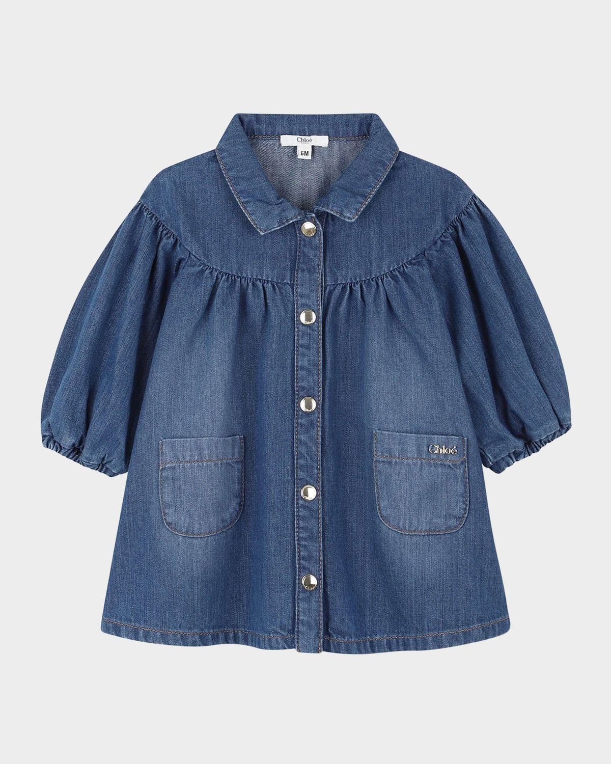Chloe denim dress boasts a goldtone metal logo plate for an elevated finish Spread collar Long sleeves with elasticized cuffs Gathered yoke Two patch front pockets Hem hits around the knee Aline silhouette Snap front closure Cotton Machine wash cold Imported