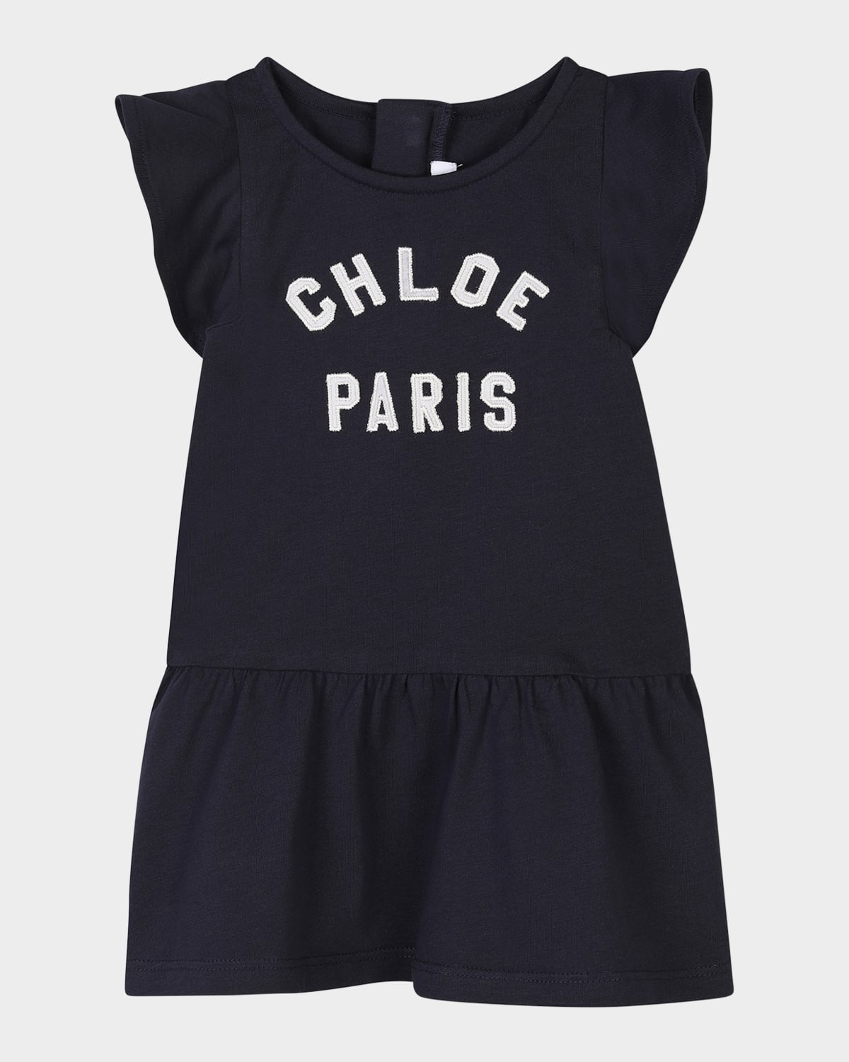 Chloé dress features logo text across the front Crew neckline Short flutter sleeves Dropped waist Ruffle hem Hem falls above the knee Aline silhouette Concealed back zip closure Cotton Machine wash cold Imported