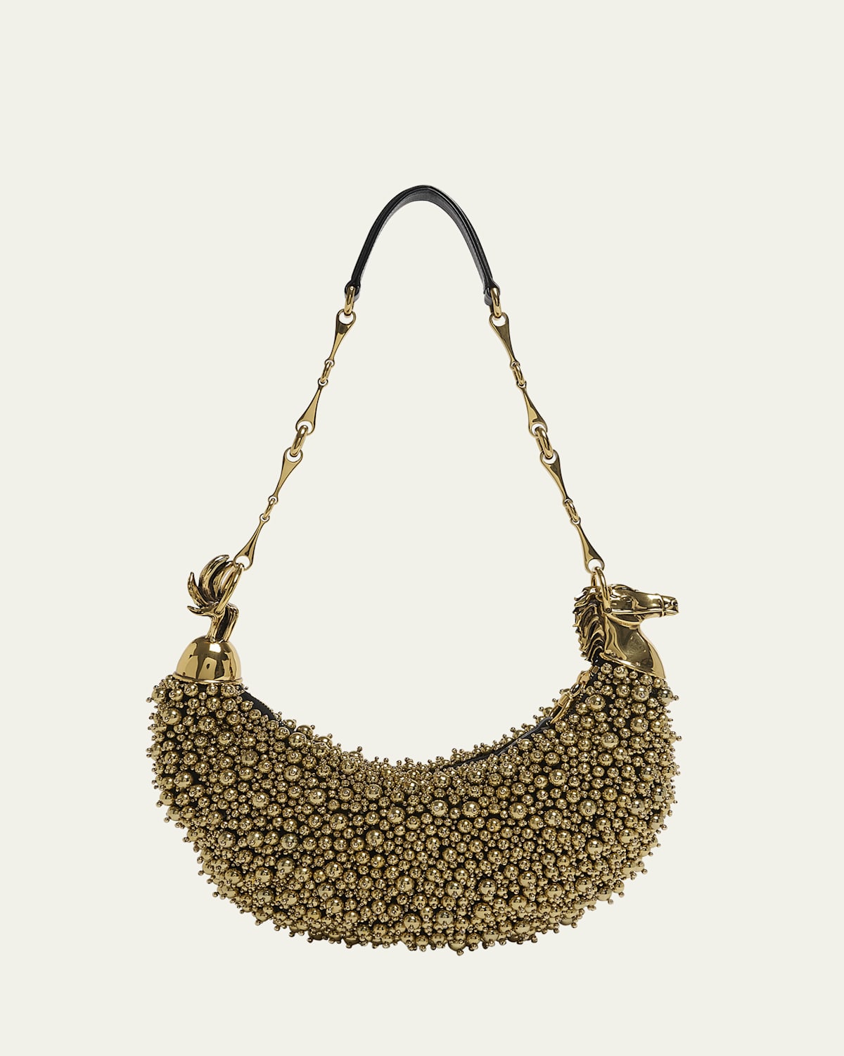 Chloe shoulder bag in lambskin suede and calf leather Embellished with metallic beading and a horse motif Flat top chain strap Zip top closure Interior, one card slot Lining: Leather Approx. 5.5"H x 13"W x 2.8"D Professional cleaning recommended Made in Italy