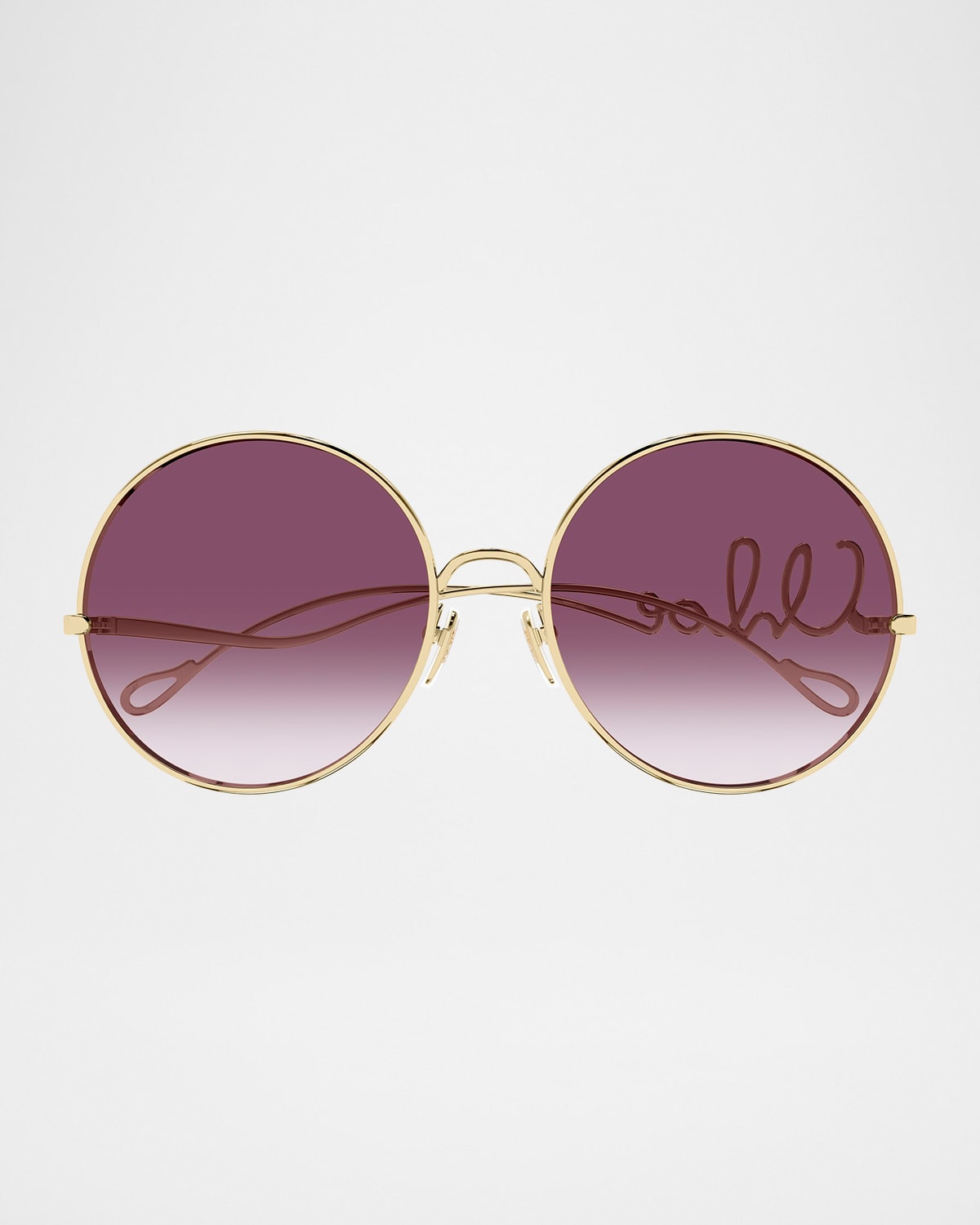 Inspired by the Maison's heritage, the "Chloé Iconic" metal sunglasses are signed with a Chloé Iconic logo insert on the left temple. Dropshaped openings at the temple tips make these sunglasses compatible with Chloé's eyewear jewelry. Lens/bridge/temple (in mm): 6019140 Oversized round frames Gradient lenses Saddle nose bridge Adjustable nose pads Thin, tapered arms 100% UVA/UVB protection Made in Italy