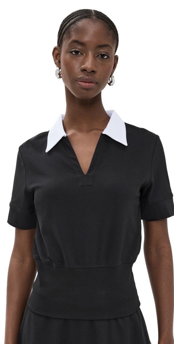 Fabric: Mid-weight, super-stretch weave. Contrast trim. Collared neck. Short sleeves. Shell: 74% cotton/26% spandex. Dry clean. Imported, China. Measurements: Measurements from size XS Length: 21.75in / 55.0cm, from shoulder