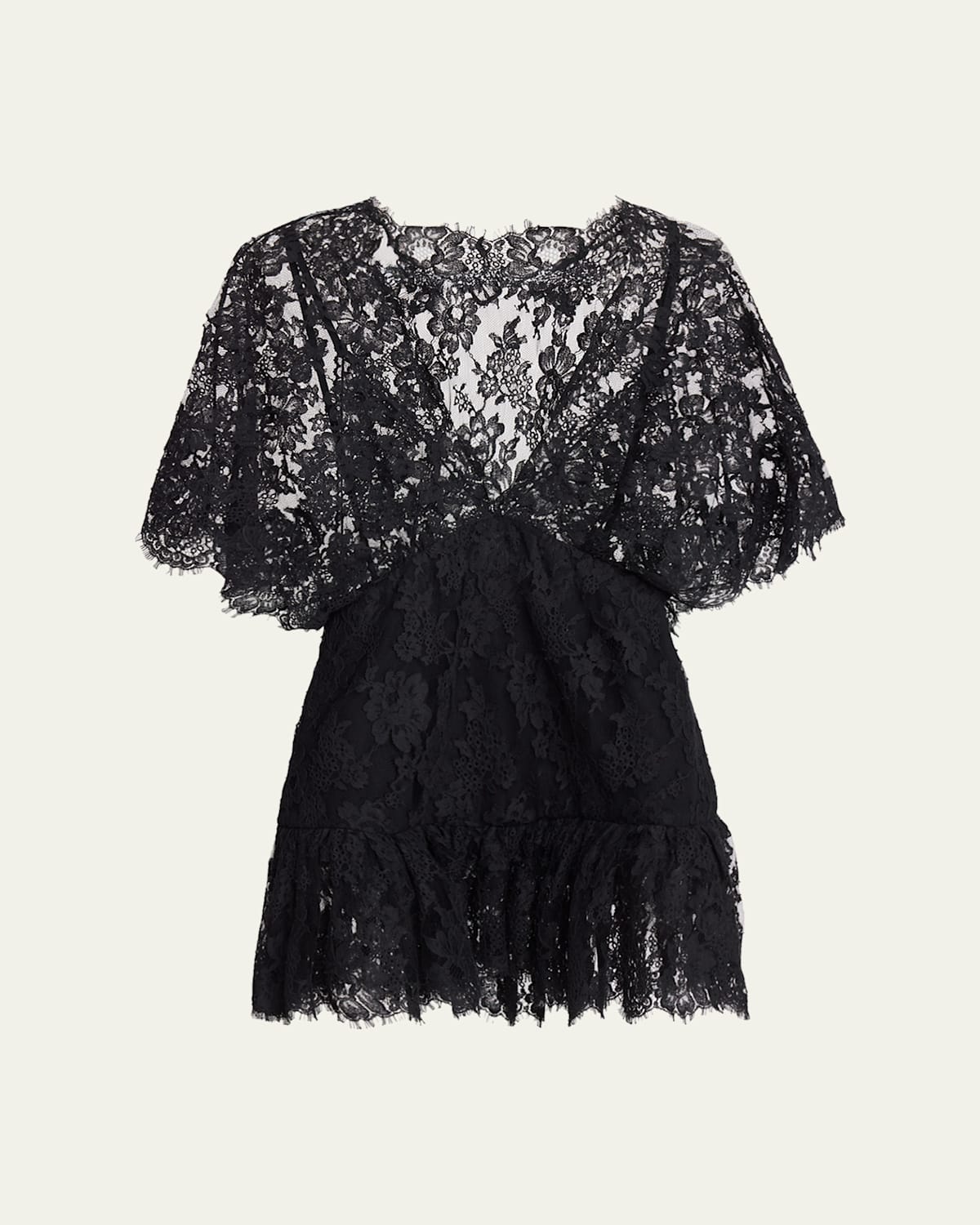 Chloe top delivers signature Parisian ease in soft lace fabric, an empire waist bust, subtle ruffles, and chic, refined finishes for understated elegance V neckline Short sleeves Empire waist Fitted Ruffle hem Side zip Cotton/nylon/polyamide Lining: Acetate/silk Dry clean, professional cleaning recommended Imported