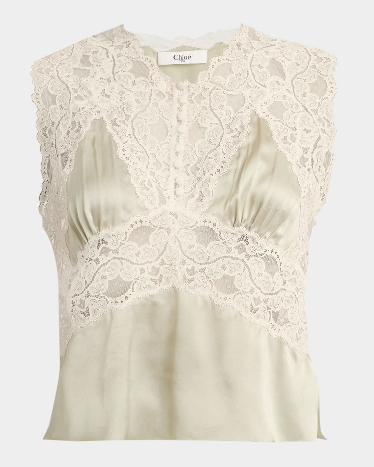 Chloe lace and silk top featuring a button front detail V neckline Sleeveless Relaxed fit Button closure Silk/nylon/polyamide Dry clean Made in Italy