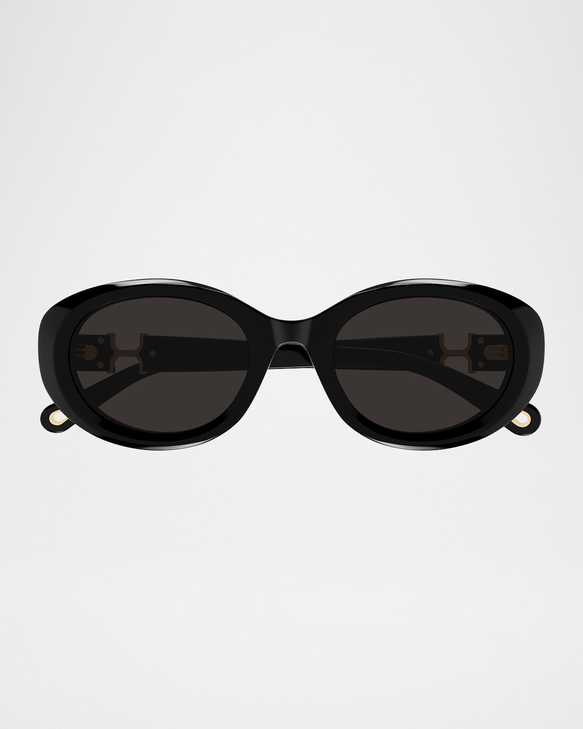 The "Marcie" acetate sunglasses by Chloé sport a shiny black beveled frame with the line's signature goldtone metal piece on the temples. Dropshaped openings at the temple tips make these sunglasses compatible with Chloé's eyewear jewelry. Lens/bridge/temple (in mm): 5322140 Oval frames Asian fit Fixed nose pads Thin, tapered arms 100% UVA/UVB protection Made in Japan