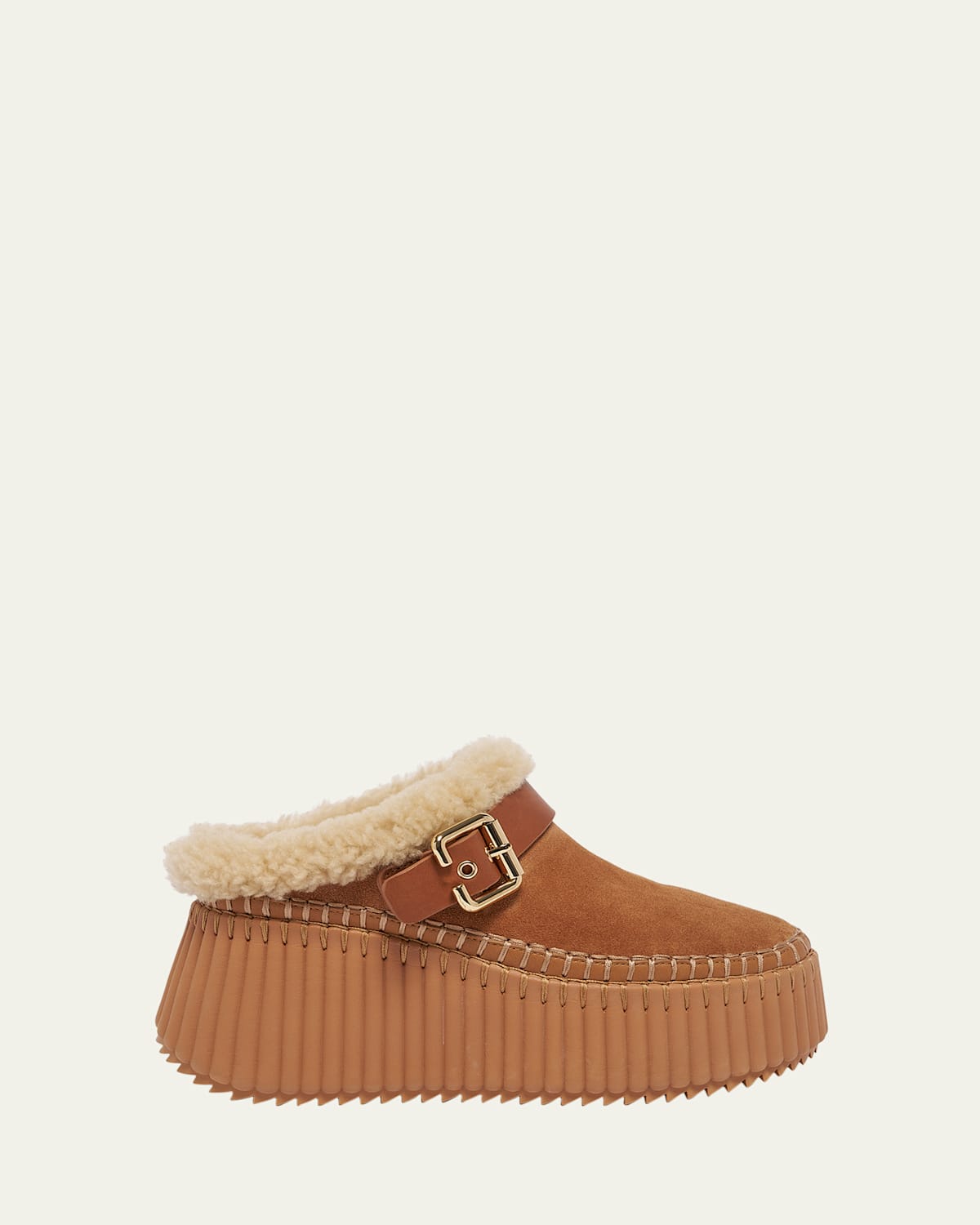 Accented with handstitched detailing, the "Nama" clogs by Chloé are made from supple suede with plush dyed sheep shearling (Australia) lining for warmth and texture 3.15 in / 80 mm ridged platform heel Round toe Goldtone buckle strap Slipon style Professional cleaning recommended Imported