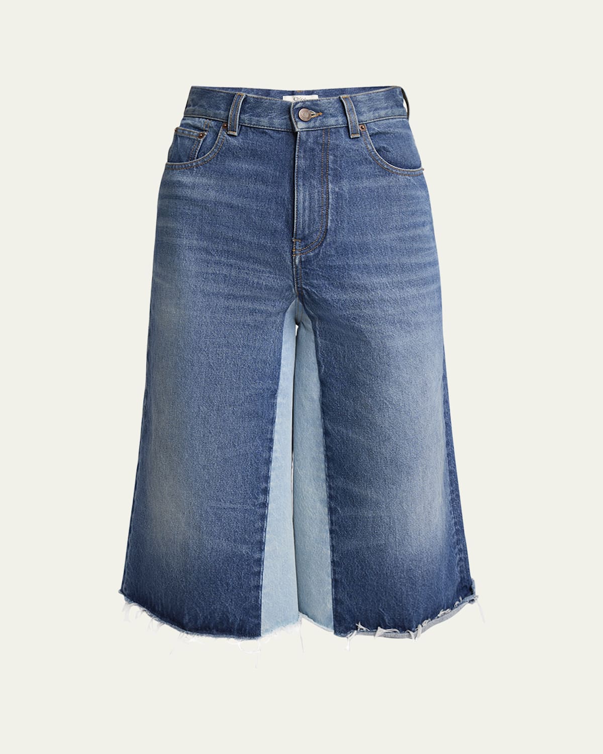 Chloe medium wash denim skirtlike Bermuda shorts featuring light wash denim panels and a raw hem High rise Fivepocket style Hem falls below the knee WideLegs Button/zip fly; belt loops Cotton Professional cleaning recommended Made in Italy