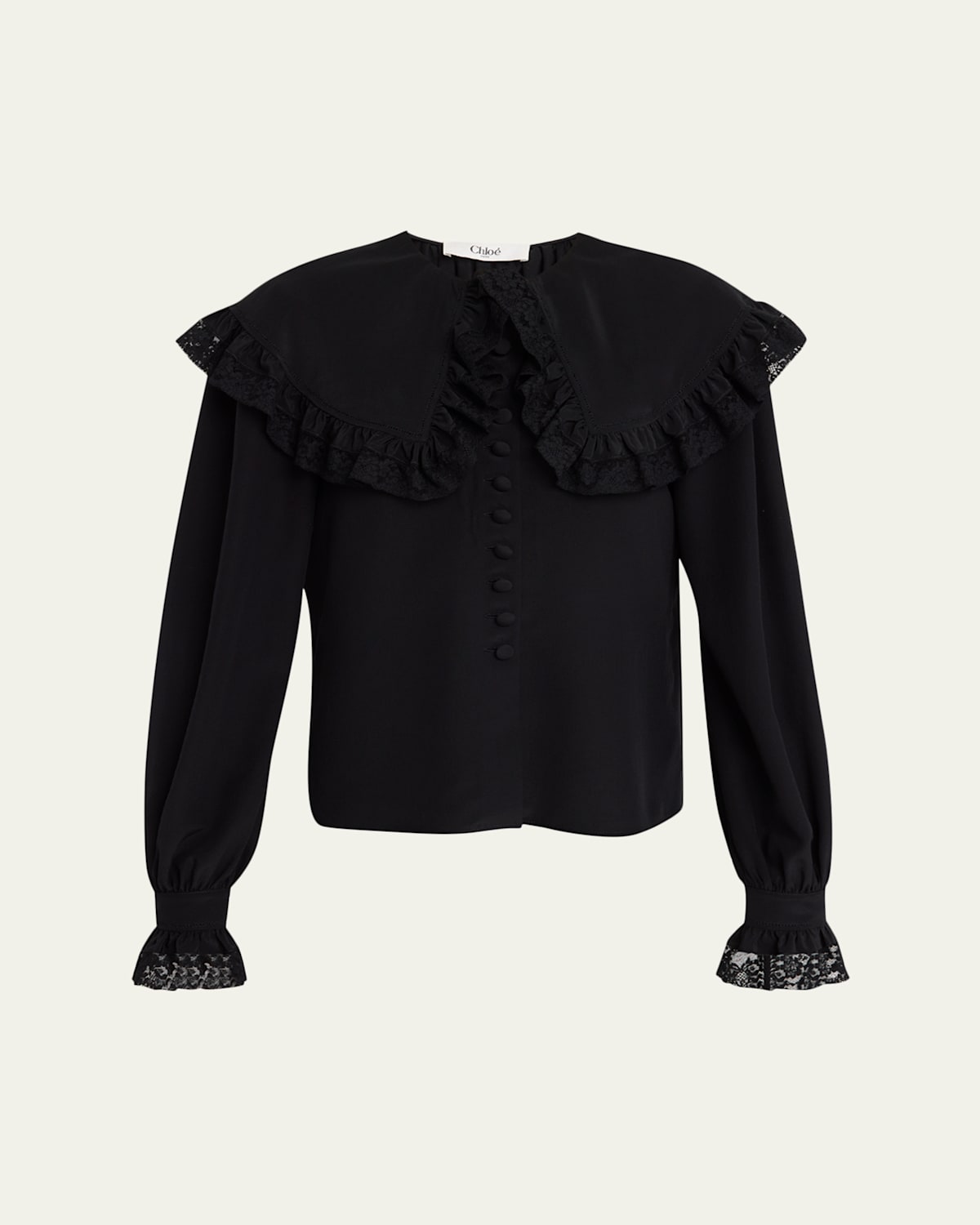 Complete with a ruffletrimmed collar and matching cuffs, the "Roscini" blouse by Chloe exudes femininity Oversized collar Long blouson sleeves; smocked flare cuffs Relaxed fit Hip length Button front closure Silk/cotton/polyester Dry clean, professional cleaning recommended Made in Italy