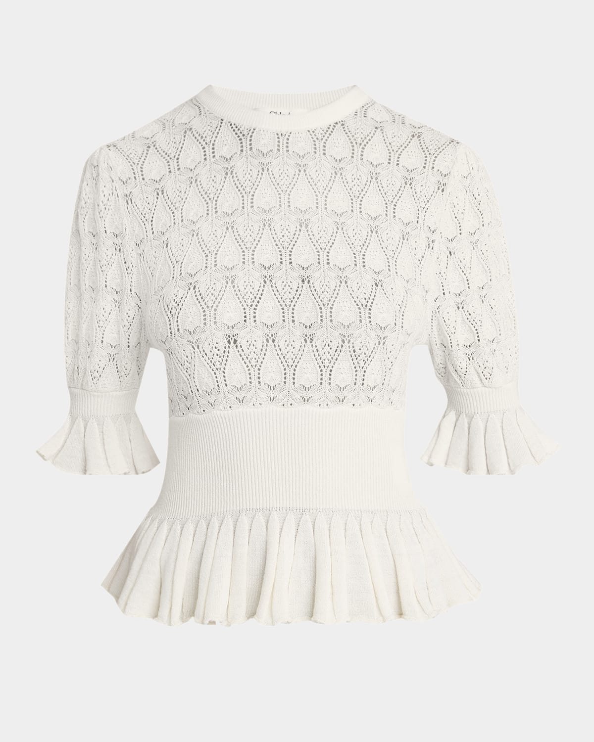 Chloe ruffled sweater featured in a baroque pointelle knit with ribbed and flared trims Crew neckline Short sleeves Signed with "C" logo embroidery on the back Wide rib waistband Peplum hem Fitandflare silhouette Slipover style Wool/viscose Dry clean, professional cleaning recommended Made in Italy