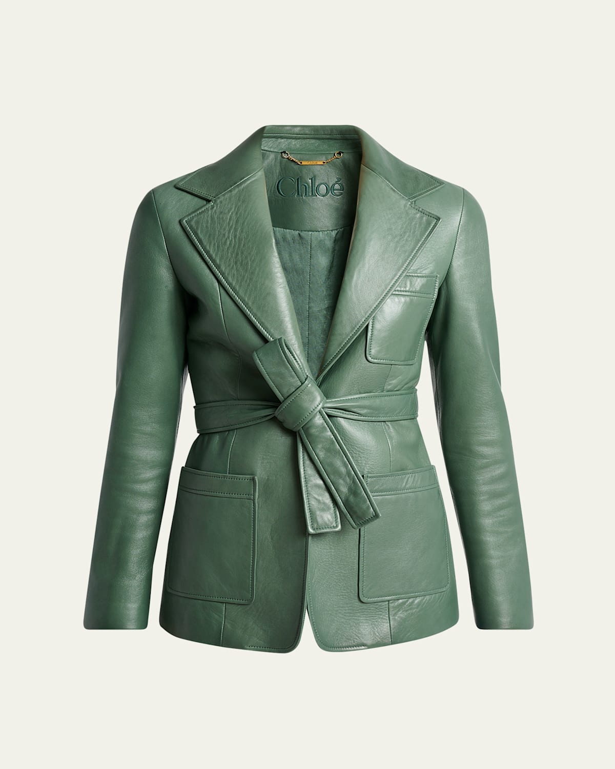 Chloe jacket in slouch lambskin leather with a self belt Notch lapels; singlebreasted front Long sleeves; button cuffs Front patch pockets Selftie cinched waist Slim fit Centerback walking vent Leather Lining: Viscose/cotton Dry clean Made in Italy