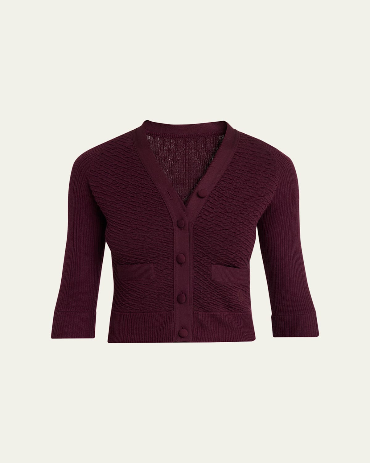 Chloe textured cardigan sweater composed of fabriccovered buttons, patch pockets, and ribbed trim V neckline; button placket Elbowlength sleeves Front patch pockets Cropped length Fitted Wool Dry clean Imported