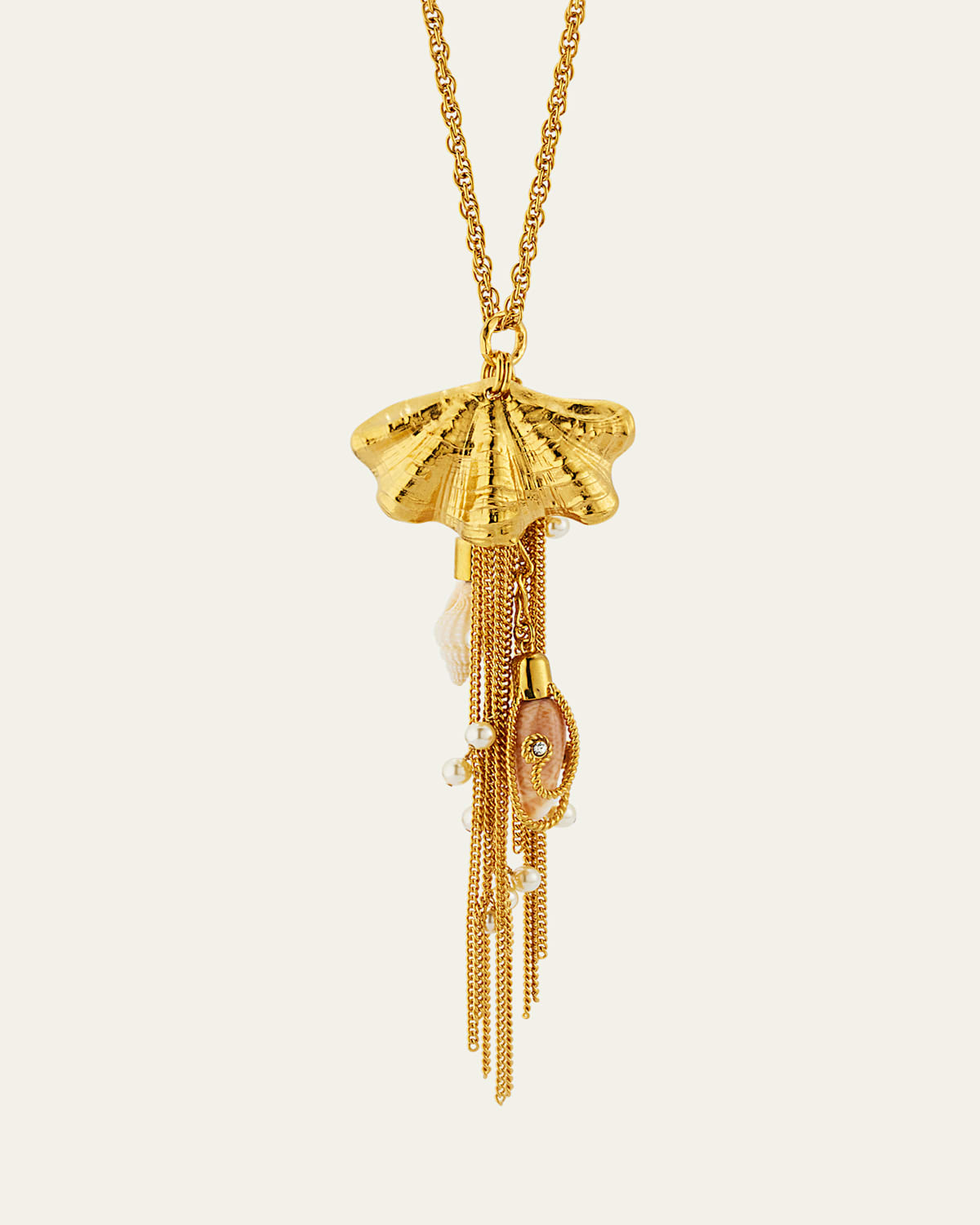Chloe pendant necklace Necklace length: approx. 1618 inches (Adjustable) Goldtone brass Faux (resin) pearls Two small natural shell charms Adjustable length Lobster clasp Made in Italy