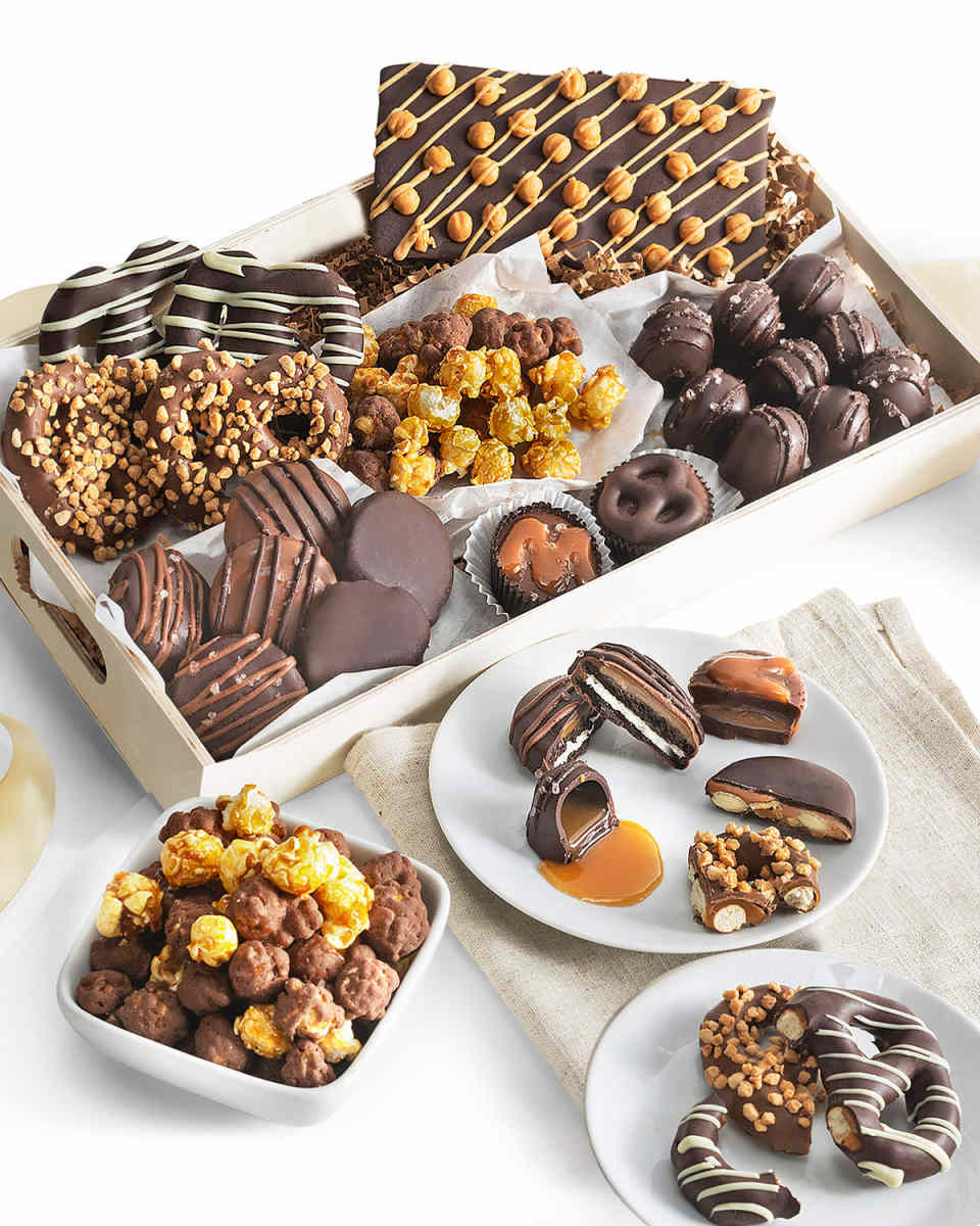 Enjoy pretzel twists coated in caramel and milk and dark Belgian chocolate, cookies with caramel and Belgian chocolate, and dark Belgian chocolate bark with caramel bits. Indulge in the rich flavors of Belgian chocolates topped with sea salt and filled with caramel, as well as the exquisite caramelfilled chocolate cups, dark chocolate caramel nut clusters, and chocolate mix caramel popcorn. Beautifully presented in a wooden tray perfect for any occasion. Made with Dark, Milk, White Belgian Chocolate Approx. 15"L x 2"T Net wt. 321 oz/9100 g Item Weight (Lbs.): 1.5 Made in USA Contains: 6 Large Pretzel Twists Covered in Caramel and Milk and Dark Belgian Chocolate. Topped with White Belgian Chocolate Drizzles and Diced Almonds 9 Dark Belgian Chocolates Topped with Sea Salt and filled with Caramel 4 Cookies Covered in Caramel then Milk and Dark Belgian Chocolate. Topped with Sea Salt 3 Oz Dark Belgian Chocolate Bark Topped with Belgian Milk and White Chocolate Drizzle and Caramel Bits 2 Belgian Milk Chocolate Caramel Filled Cups 2 Belgian Dark Chocolate Covered Caramel Nut Clusters 4 Oz Caramel Popcorn amp; Belgian Milk Chocolate Covered Caramel Popcorn Mix