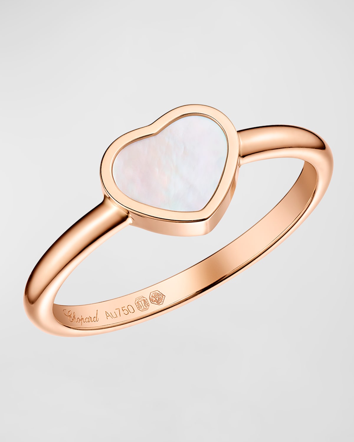 Chopard ring in 18karat rose gold Heartcut white motherofpearl My Happy Hearts jewelry collection borrows its most famous codes, the heart, and mobile diamonds, from Chopard's legendary creations. Made in Germany Care Instructions: Wash with a nonchemical liquid soap. Rinse piece under water, avoiding any stones.
